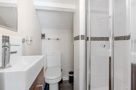 With step down to shower cubicle with Mira Play electric shower, wash hand basin set into base unit with light/shaver point over, close coupled low level WC, ceiling light, extractor fan, undereaves storage cupboard.
