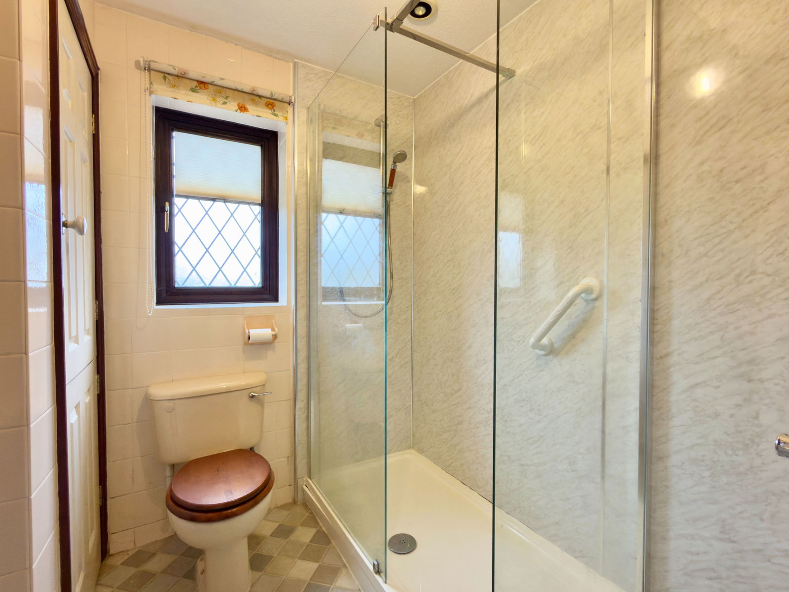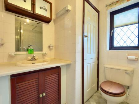 Double shower cubicle, low flush WC and wash hand basin with vanity surround and cupboard under, cupboard housing Worcester gas boiler supplying central heating, heated towel rail.