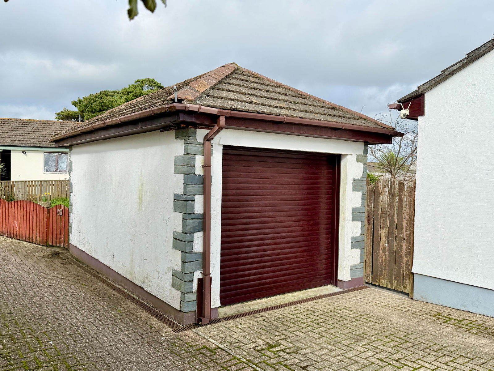 With electrically operated scroll door opening to front, pitched roof with eaves storage, light and power, double glazed door in UPVC frame to rear.