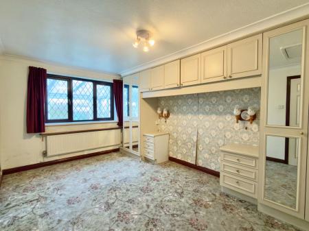 Double glazed window in UPVC frame to side with view into conservatory, radiator, built-in wardrobes and bedside units, access to roof space.