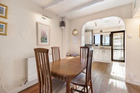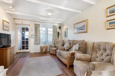 Single aspect room with window overlooking front elevation. Beamed ceiling with 3 centre ceiling lights and ornate ceiling roses. Fuse box, television point, telephone point, 2 central heating radiators, stairs to first floor, arch into: