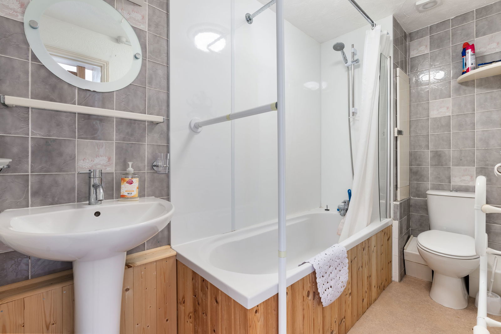Panelled bath with shower over, pedestal wash hand basin with light/shaver point, low level WC, centre ceiling light with ceiling rose, extractor fan, part tiled walls, central heating radiator.