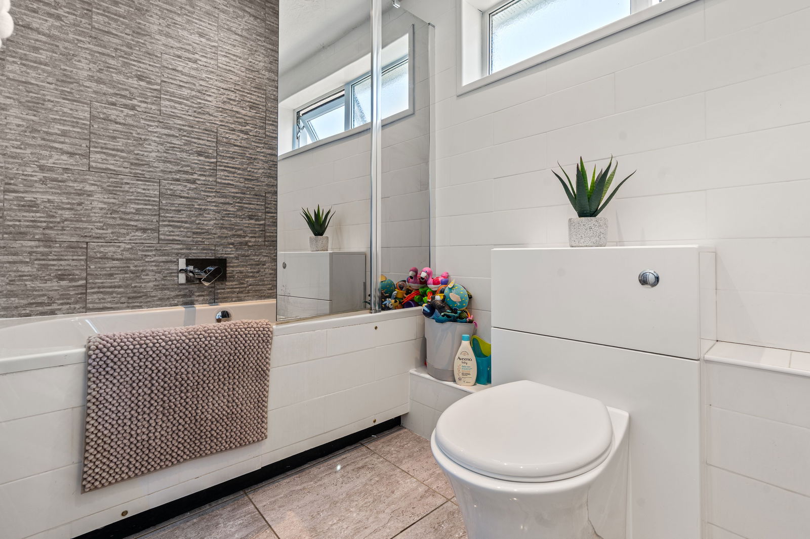 Panelled bath with over shower and glazed side screen, low flush WC and wash hand basin with vanity unit under, heated towel rail, tiled floor, opaque pattern double glazed window in uPVC frame to rear.