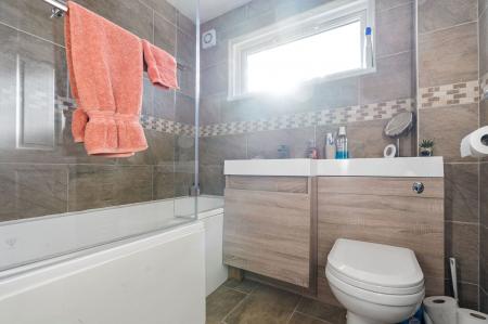 Single aspect room, contemporary bathroom suite comprising 'P' shaped bath with shower over and glazed shower screen to side, feature sink with built in base unit, close coupled low level WC, ladder rack towel rail, fully tiled walls, tiled floor, centre ceiling light, extractor fan.