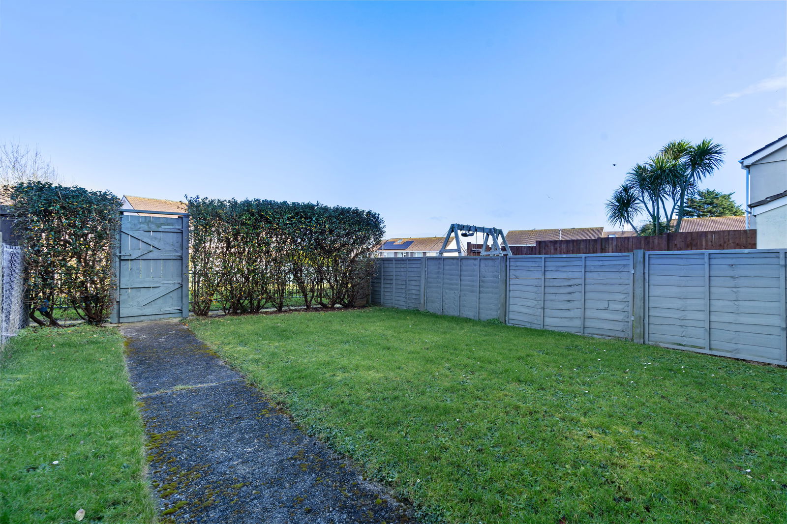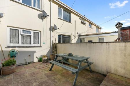 Two tiered paved Patio with garden fence and gate providing access to the rear of the property.