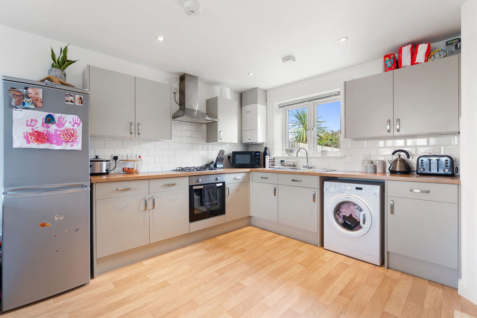 A large dual aspect room with double glazed window in UPVC frame to front and rear. The kitchen is fitted with a superb range of modern units comprising base cupboards with worktops over and eye level wall cupboards above. Integral electric oven, four ring gas hob, space and power for fridge and washing machine, one and a half bowl stainless steel sink unit and mixer tap, wall mounted gas boiler supplying central heating, door to: