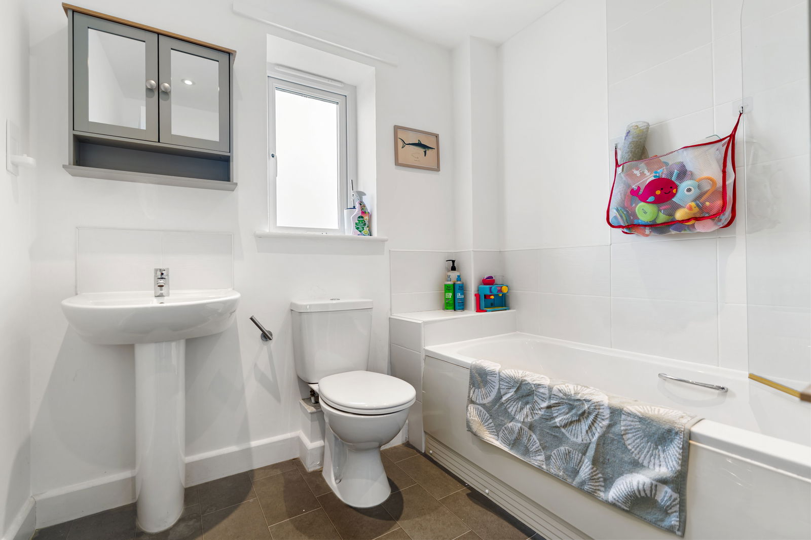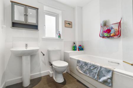 Panelled bath with shower with glazed shower screen, wash hand basin and low flush WC, heated towel rail and extractor fan.