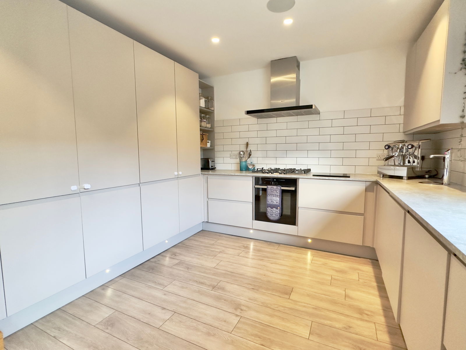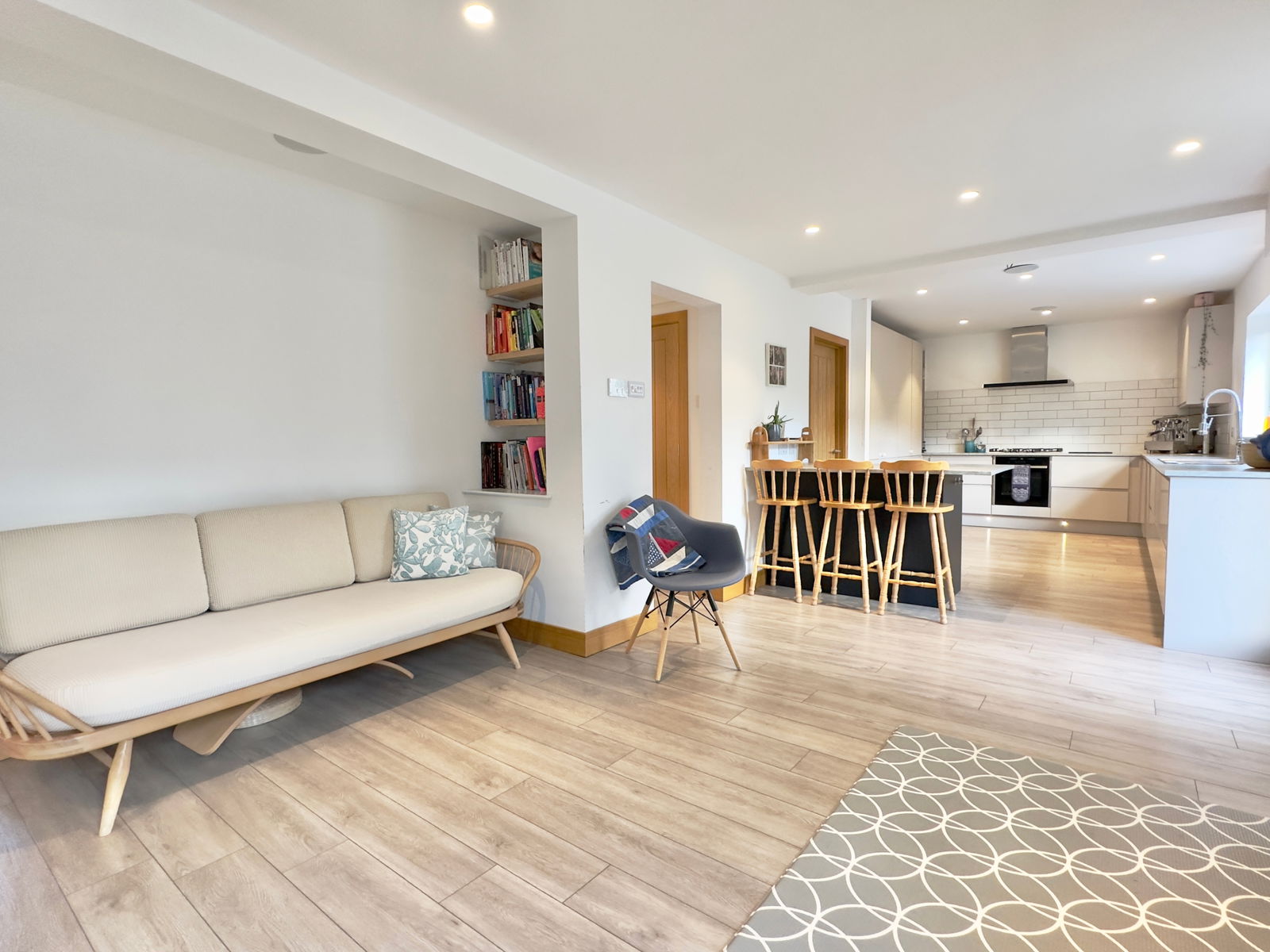 - Large open-plan kitchen/dining/day room with wood burner and integrated appliances