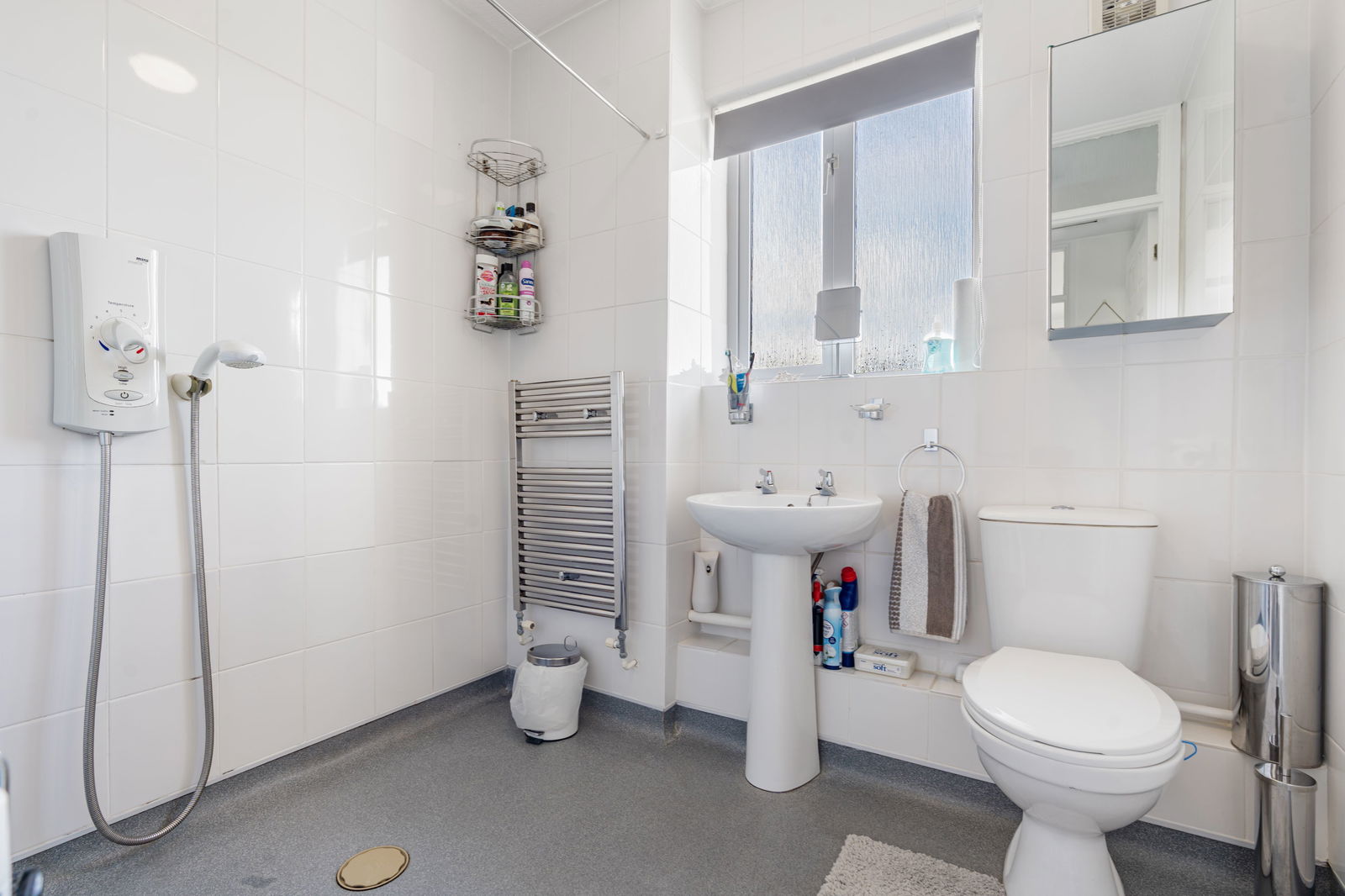 Wall mounted Mira electric shower unit, low flush WC and pedestal wash hand basin, heated towel rail, extractor fan, opaque patterned double glazed window in UPVC frame to rear.