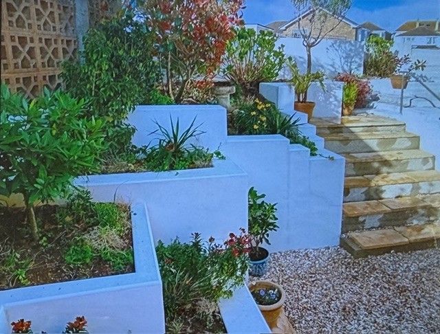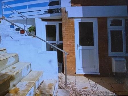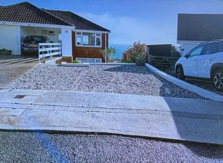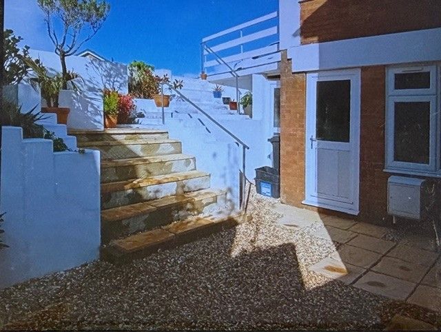 FRONT/SIDE GARDEN Dropped walkway for easy access for car parking, motor home or small caravan. Steps leading down to small courtyard area with access to outside storage and electric cupboard meter.