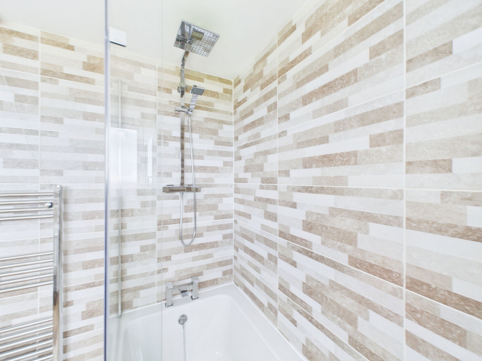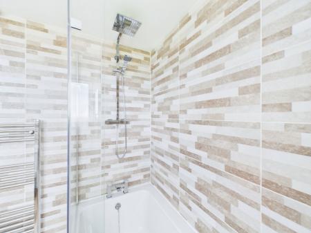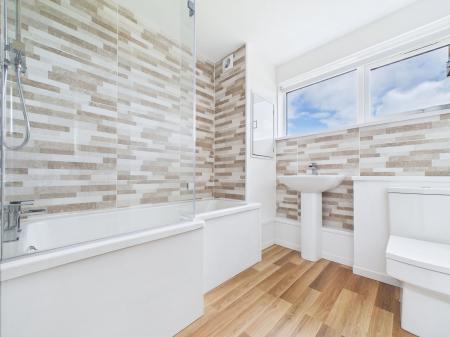 BATHROOM Re-fitted white quality suite with paneled bath and shower plus screen. Pedestal wash basin and low level WC and uPVC double glazing. Sea views. Chrome heated towel rail.