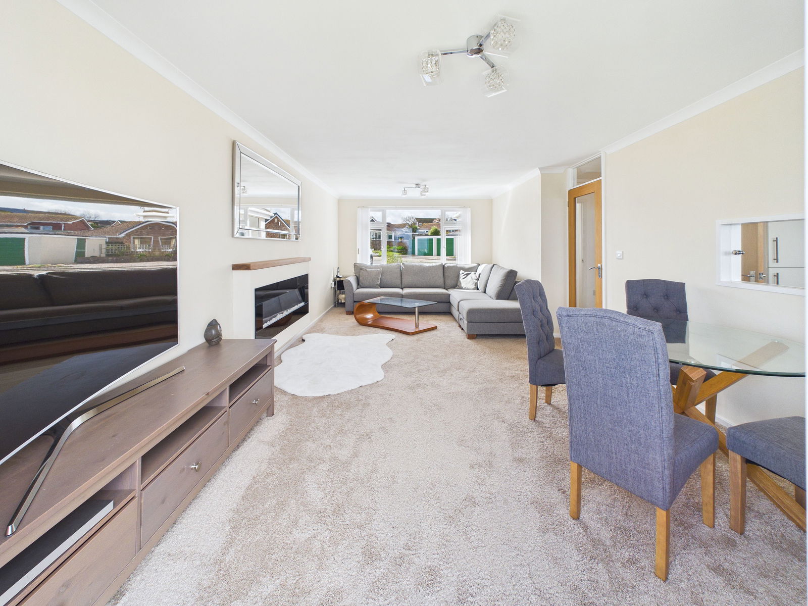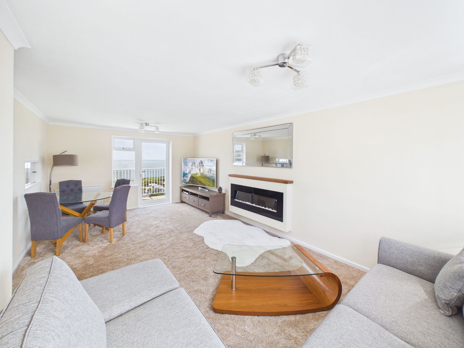 LOUNGE/DINER The sea views from this room are unbelievable stunning. Double aspect and two central heating radiators. Inset electric fire, uPVC double glazing and uPVC door onto:-
