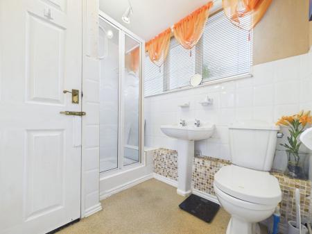 SHOWER ROOM Fitted with a white suite comprising shower cubicle with Mira mains fitted shower. Pedestal wash hand basin and low-level WC with dual flush. Part tiled walls. Large double glazed window. Range of toiletry cabinets.