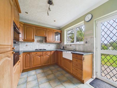 KITCHEN Range of fitted wall and base units with integrated appliances and butler sink. uPVC double glazed window and door. Central heating radiator.