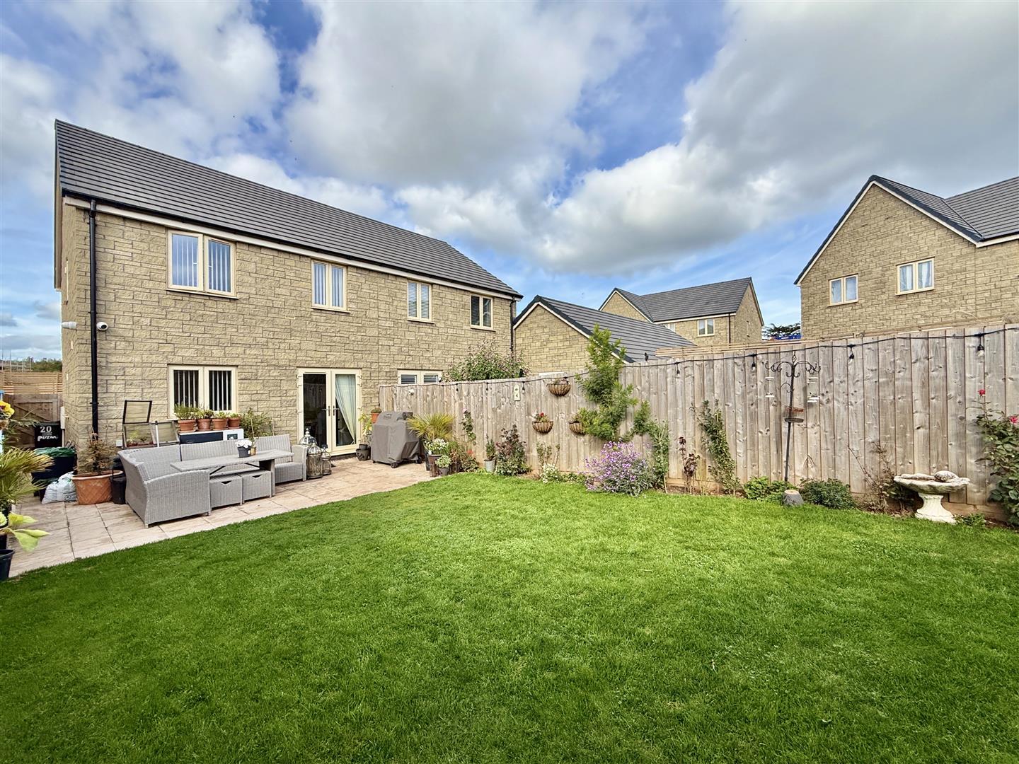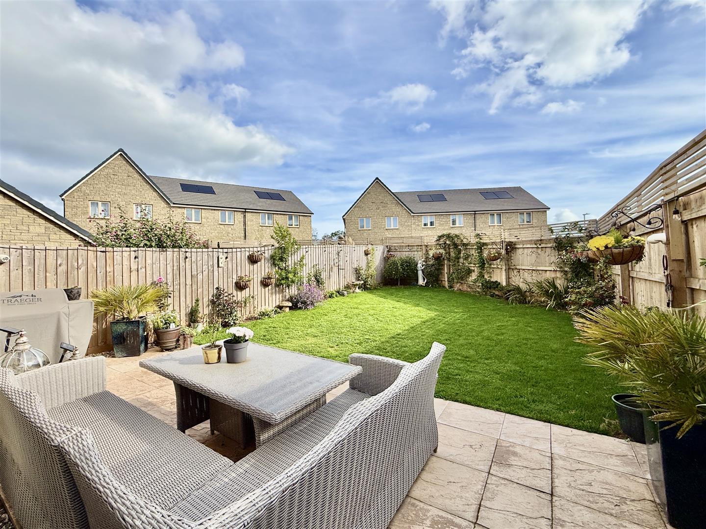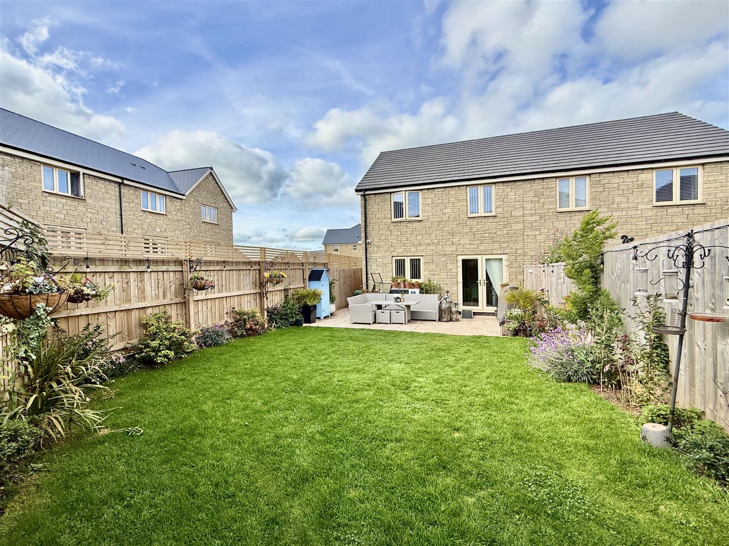 Outside, the property continues to impress. The rear garden is private, enclosed and beautifully landscaped, with a paved patio area leading directly from the kitchen diner, creating the perfect setting for al-fresco dining. Beyond this, a lush lawn is bordered by colourful planting, making it ideal for children, pets, or those who simply love an attractive outdoor space. To the front, there is private driveway parking and a large garage with light and power, offering further flexibility and convenience.