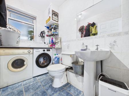 UTILITY ROOM / WC A practical utility room incorporating a low level WC and pedestal wash hand basin. There is space and plumbing for a washing machine and tumble dryer with roll edged work surfaces above. Finished with tiled walls and a gas central heating radiator.