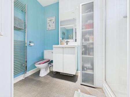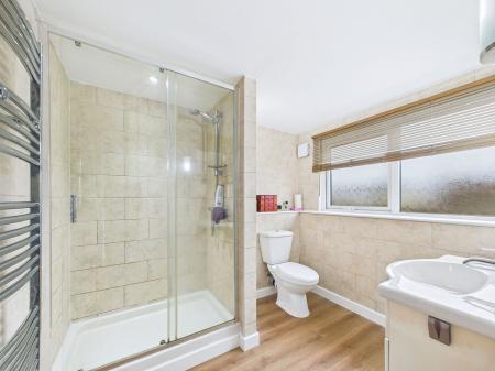 EN-SUITE A spacious en-suite bathroom featuring a low level WC, vanity wash hand basin with fitted storage and a walk in double shower. Complementary tiling, an obscure uPVC double glazed window, extractor fan and chrome heated towel rail.