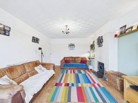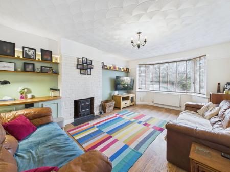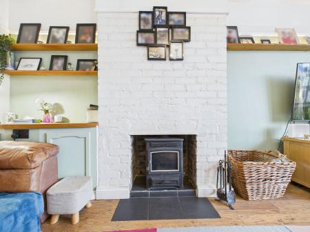 LIVING ROOM A wonderfully bright and generously proportioned living room positioned to the front of the property. This inviting space features a charming log burning stove, a uPVC double glazed bay window and a gas central heating radiator.