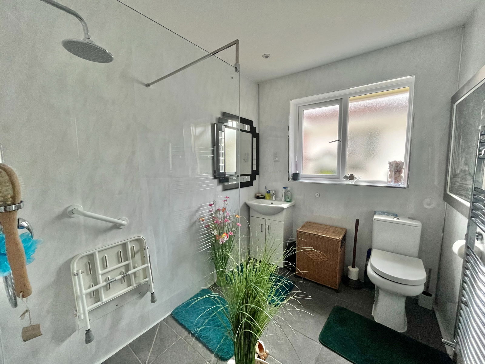 SHOWER ROOM Replaced luxury walk in walk out shower, vanity basin , low level WC, chrome heated towel rail and uPVC double glazing.
