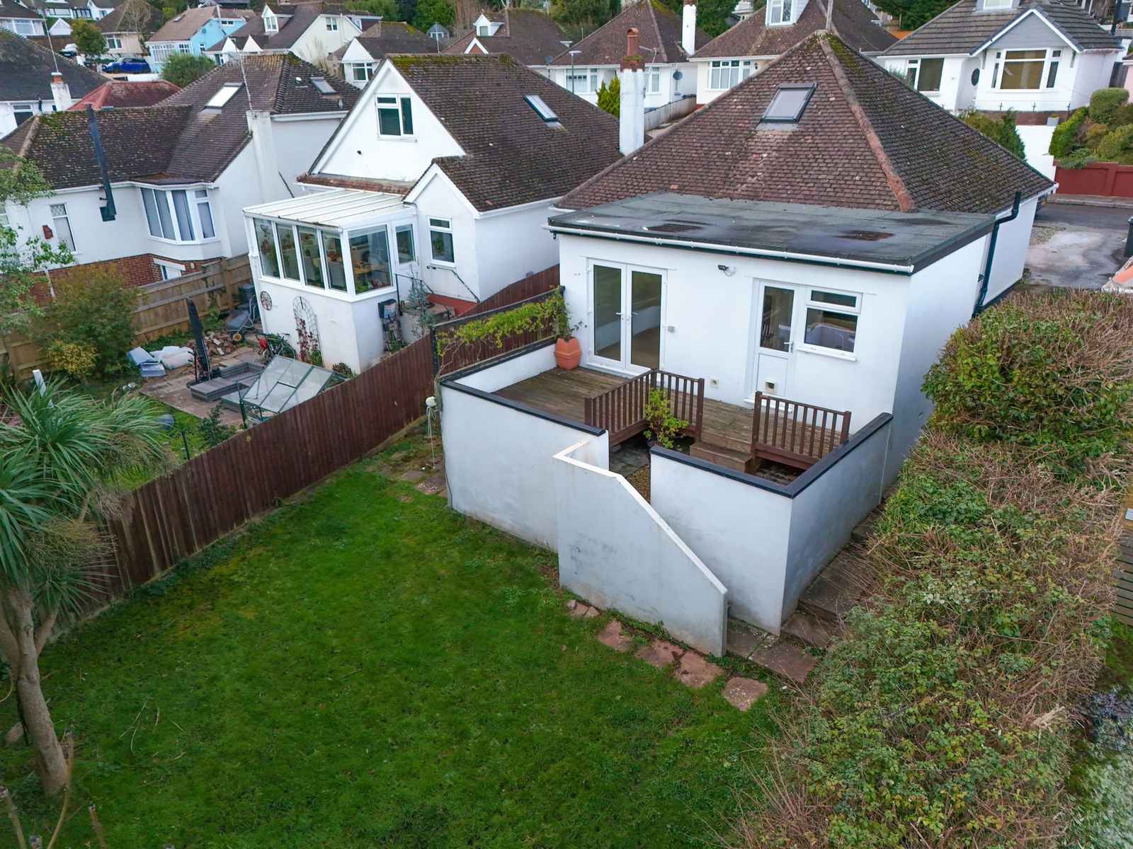 REAR GARDEN A south east facing rear garden featuring a substantial sun deck accessed directly from the living area, perfect for alfresco dining. Steps lead down to a generous lawn with an additional patio area beyond.