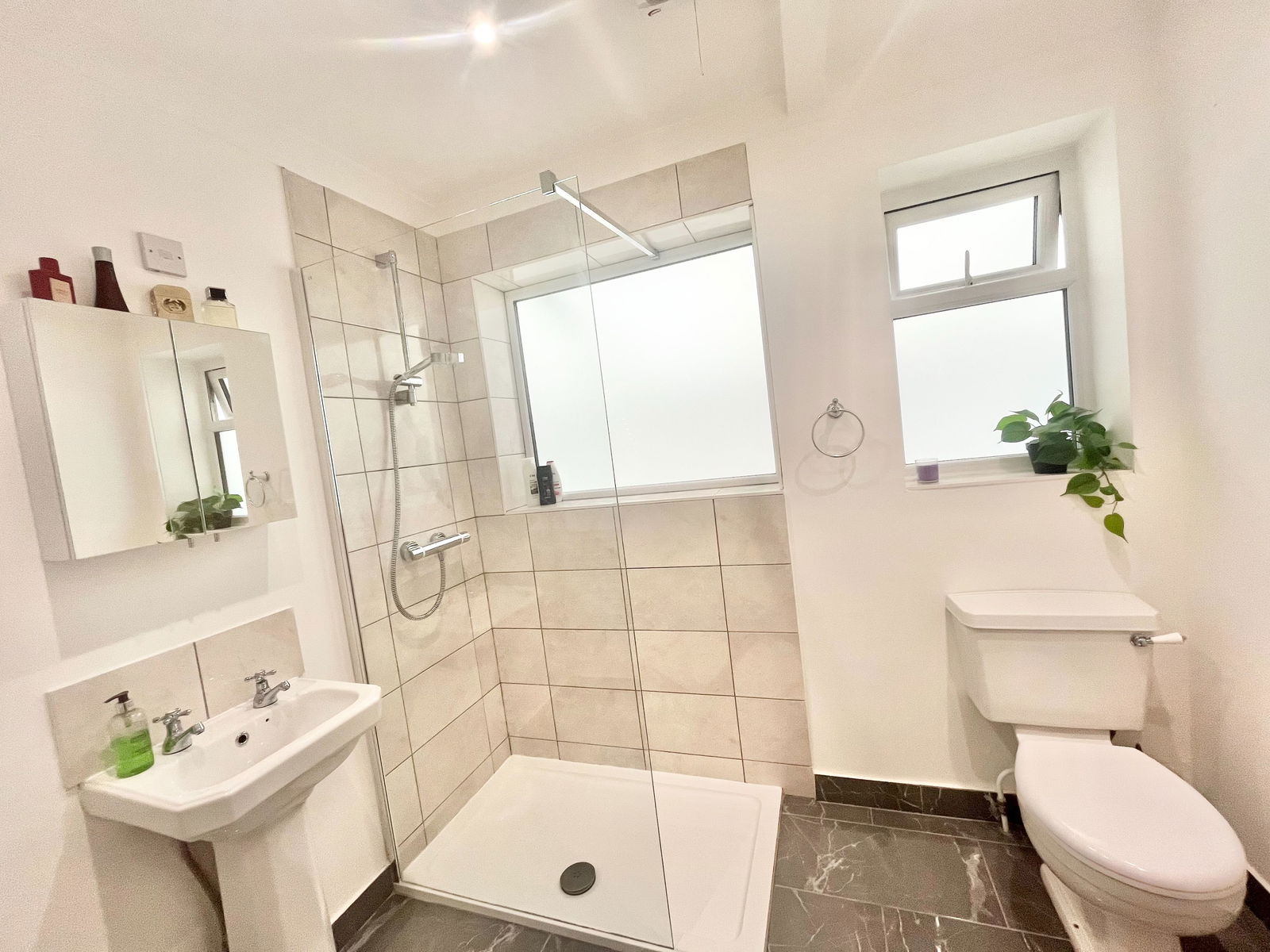 SHOWER ROOM Fully tiled walk-in enclosure with Mira shower and glazed screen. Pedestal wash basin with tiled splashback. Low level W.C. Heated towel rail. Coved ceiling. Inset spotlights. 2 x UPVC frosted windows to side with deep sills, ideal for display. Tiled floor.