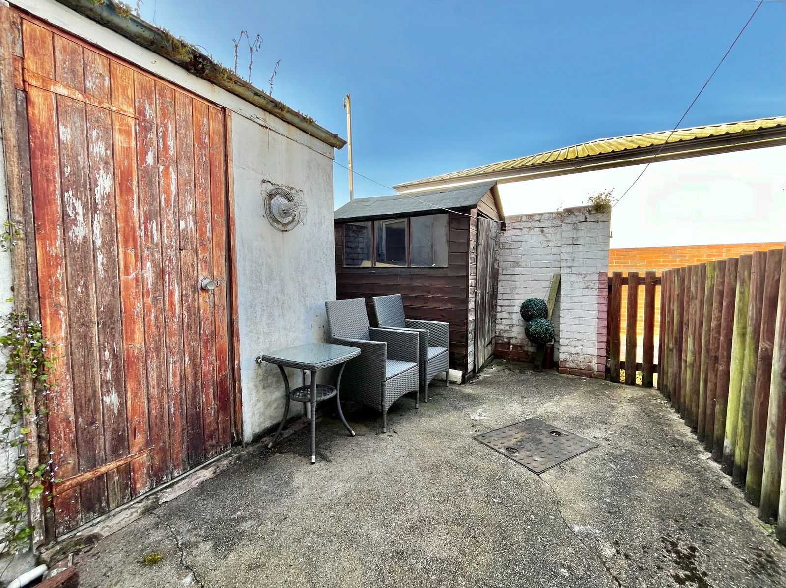 GARDEN A courtyard garden laid to concrete ideal for outdoor dining. Outhouse utility building, shed and gate access.