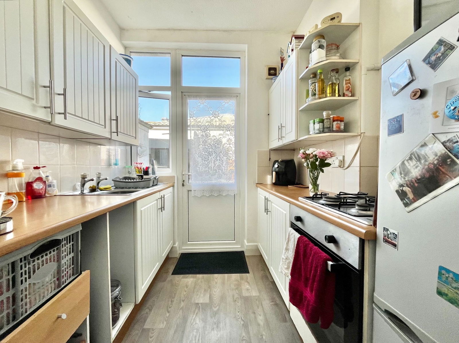 KITCHEN - 2.93m x 2.19m (9'7" x 7'2") A range of overhead, base and drawer units with roll edged work surfaces above. A 1 bowl stainless steel sink and drainer unit with mixer tap above. An electric single oven with grill integrated, a four ring gas hob with extractor hood above, space and plumbing for a fridge freezer. uPVC double glazed window and a uPVC double glazed door leading out to the courtyard garden.