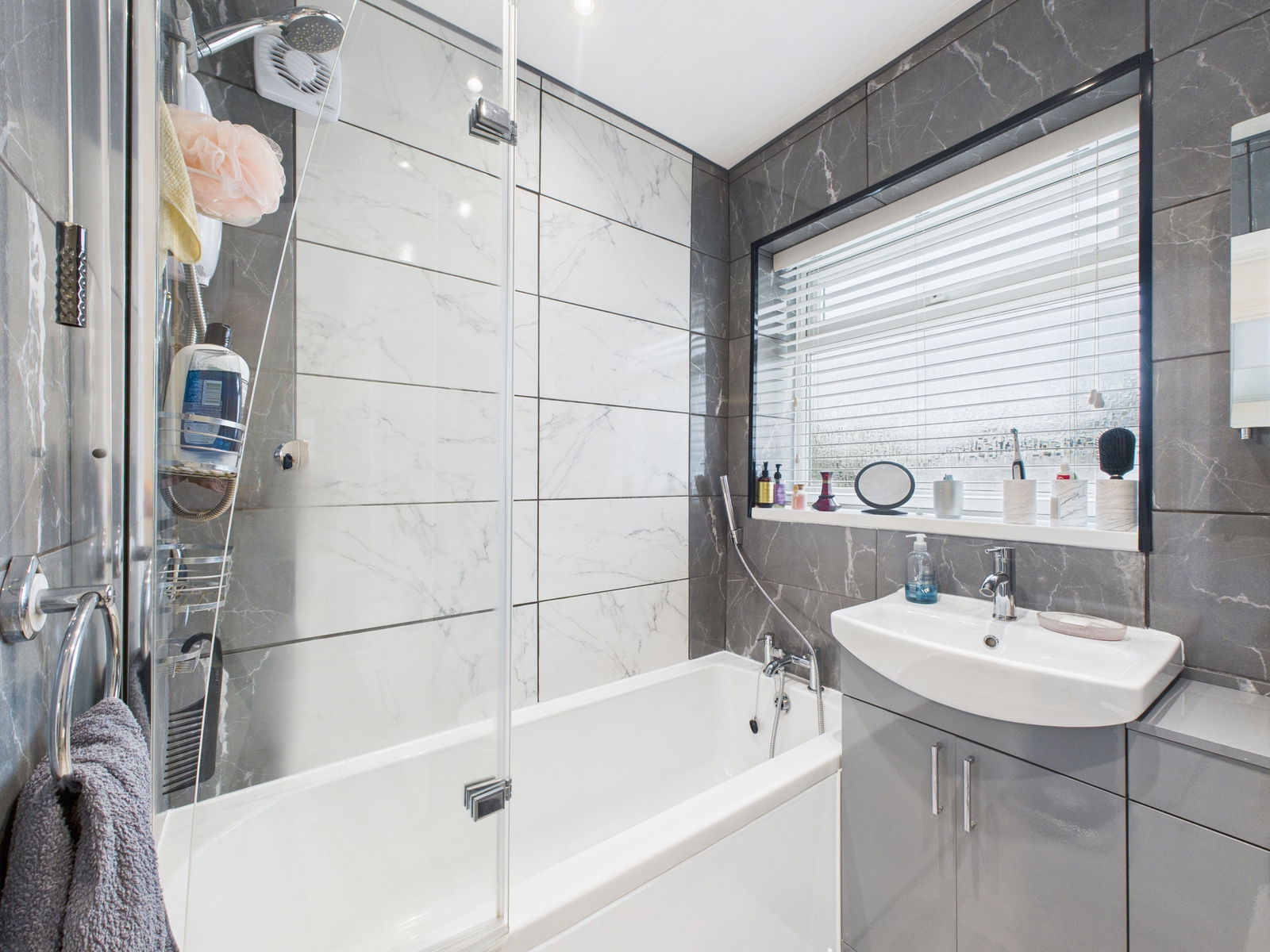 FAMILY BATHROOM Stylishly presented, the modern family bathroom comprises a low level WC, vanity wash hand basin with storage and a panelled bath with overhead shower and glass screen. Finished with elegant tiling, a heated towel rail and an obscure uPVC double glazed window.