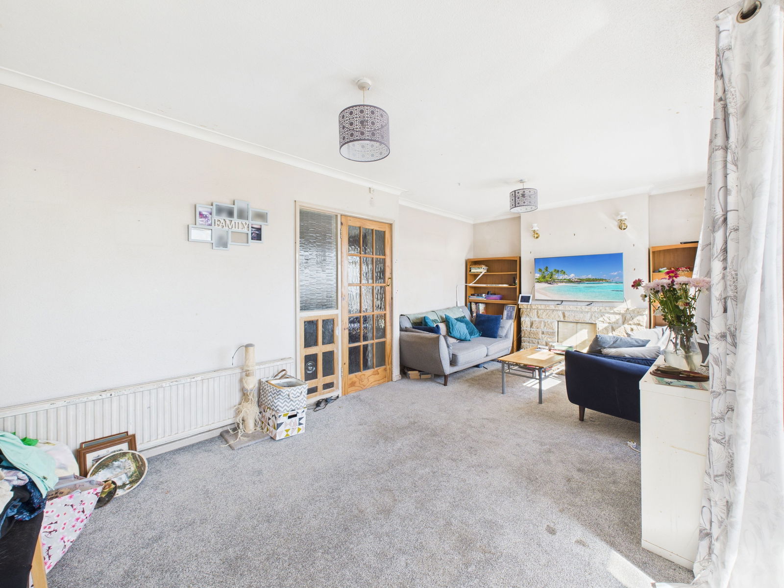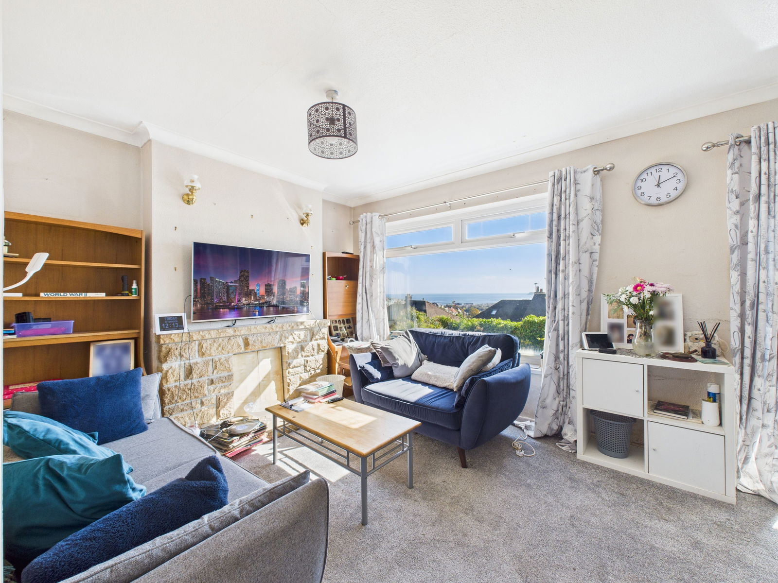 LIVING ROOM - 5.9m x 3.18m (19'4" x 10'5") A large and light filled living room boasting spectacular sea views across to Berry head, Brixham. The room offers space for ample furniture, tv and internet points, a feature fireplace surround, a gas central heated radiator, uPVC double glazed window and a uPVC double glazed sliding patio door leading into a rear porch.