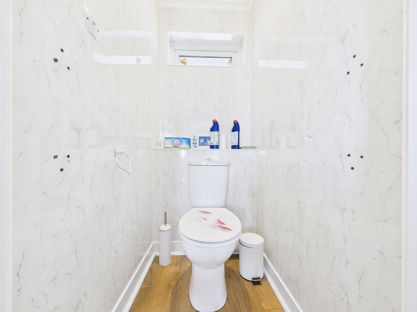 CLOAKROOM A low level flush WC, complimentary wall panelling and a uPVC double glazed window.