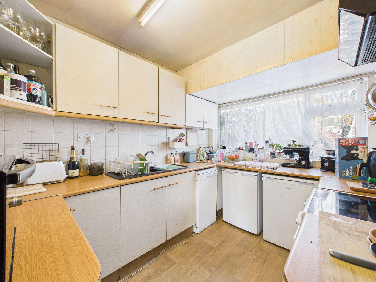 KITCHEN - 3.32m x 2.42m (10'10" x 7'11") A sizeable kitchen fitted with a range of overhead, base and drawer units with roll edged work surfaces above. A 1 1/2 bowl sink and drainer unit, an electric cooker with extractor hood above, space and plumbing for a slimline dishwasher, fridge and freezer, tile backsplash and a uPVC double glazed window.