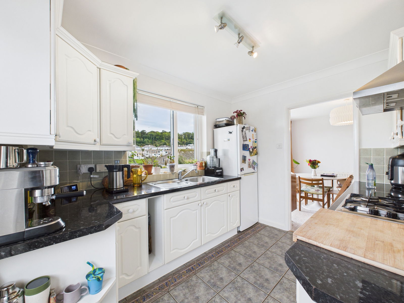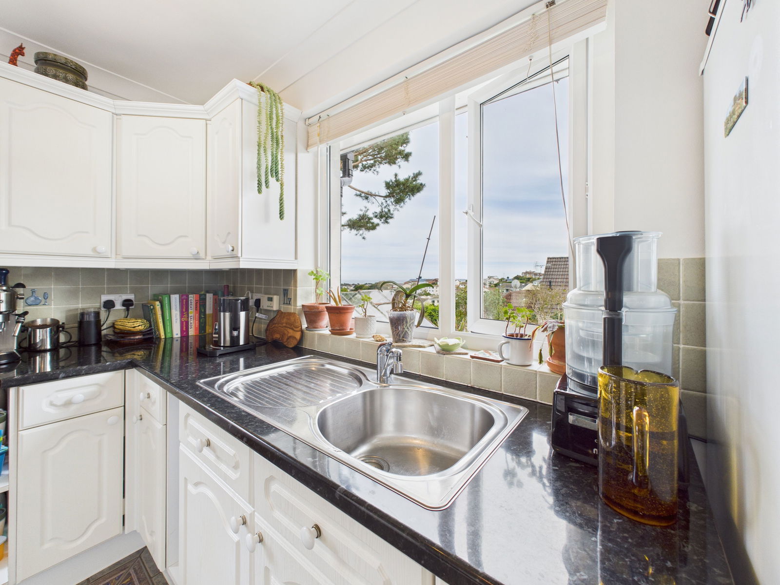 KITCHEN Fitted with a range of white wood effect wall and base units with granite effect work surface. Single drainer stainless steel sink unit. Space for fridge freezer. Built in stainless steel gas hob and matching electric oven below. Stainless steel cooker hood. Plumbing for dishwasher/washing machine. Part tiled walls. Digital programmer for central heating and hot water. Double glazed window enjoying excellent sea views. Radiator. Door to garage. Double glazed door to outside.
