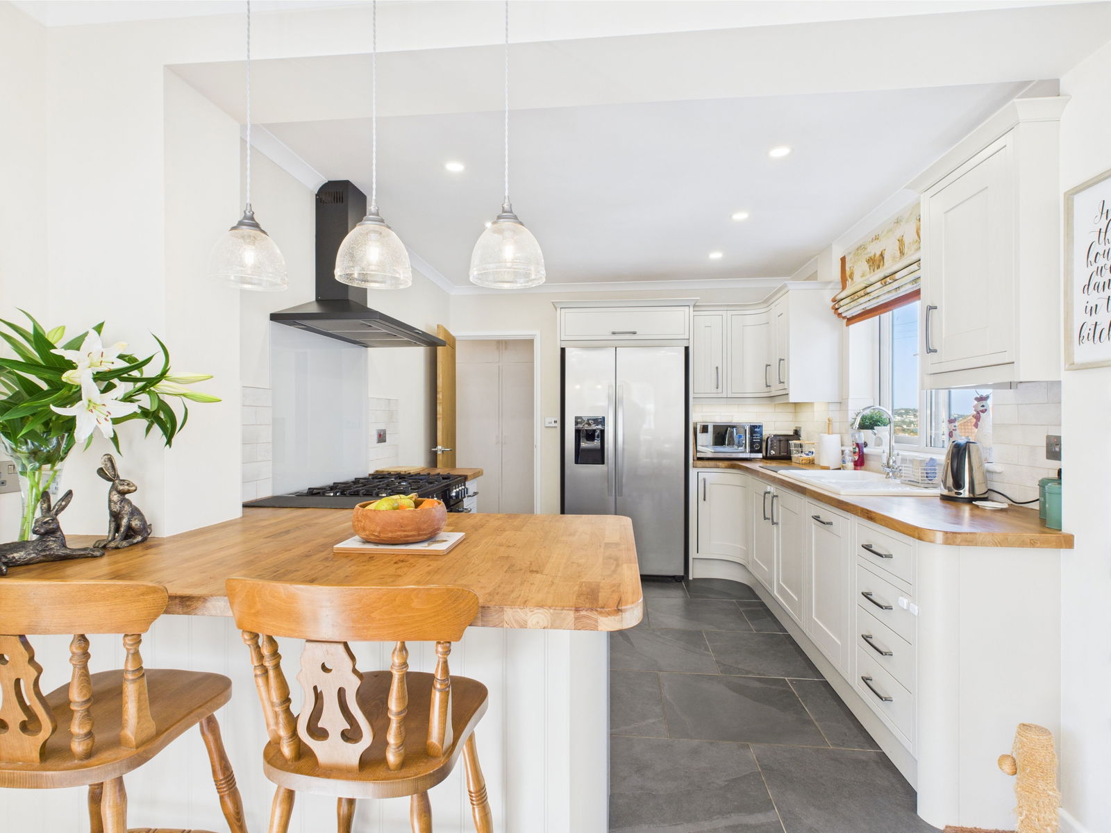 KITCHEN / DINER This beautifully appointed farmhouse style kitchen blends luxury with functionality. Featuring a range of shaker style wall, base and drawer units topped with oak work surfaces. A 1 1/2 bowl porcelain sink with drainer, a range style gas cooker with 7 ring hob and extractor hood above as well as an integrated dishwasher. There’s space and plumbing for an American style fridge freezer, while the generous dining area comfortably accommodates a 6-8 seater table. Triple aspect uPVC double glazed windows fill the space with natural light with a glazed door leading to the side of the property and French doors opening onto the sun drenched rear garden. Finished with a gas central heated radiator.