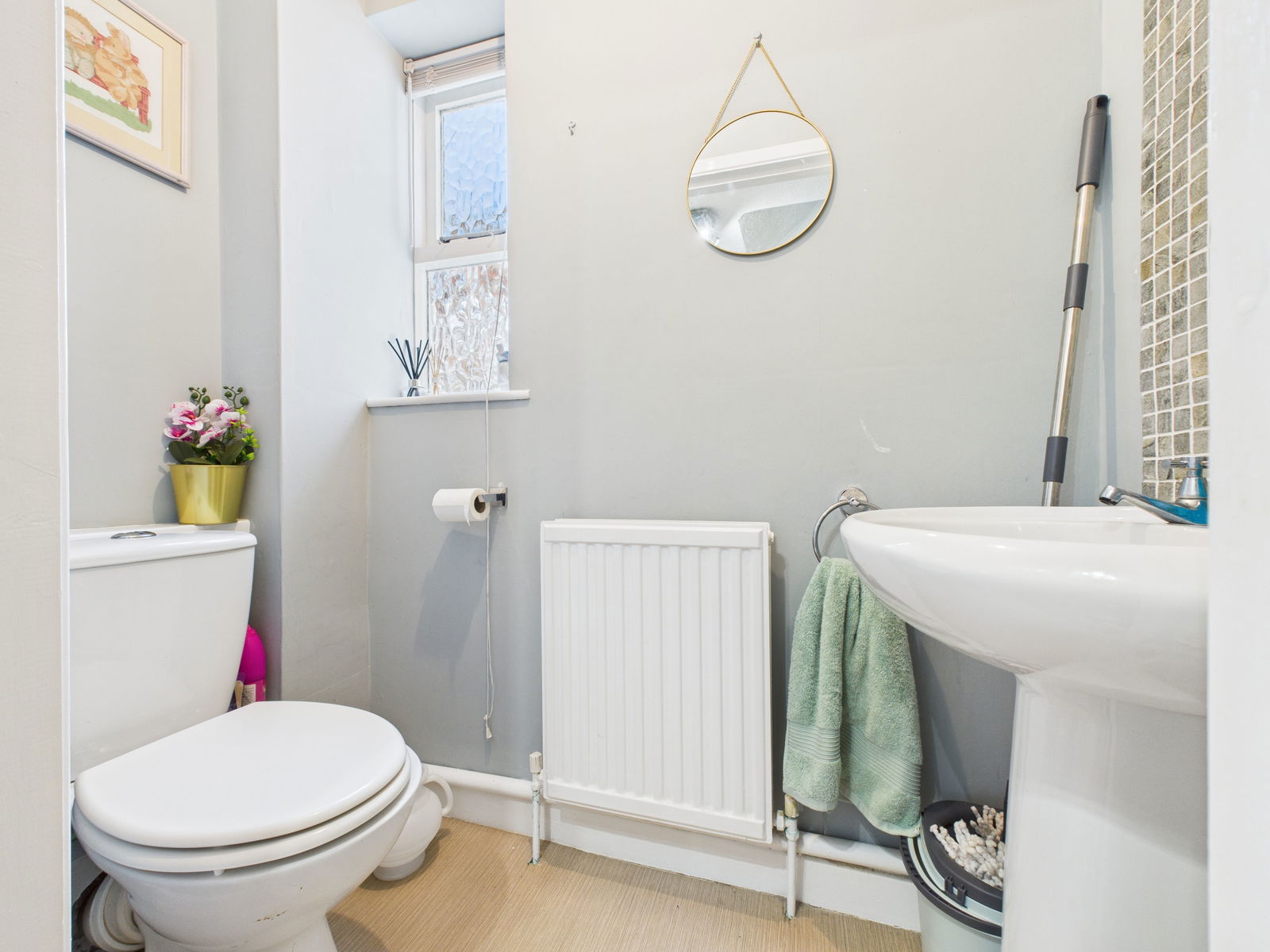 CLOAKROOM A low level flush WC and a pedestal wash hand basin with complimentary tile backsplash, wooden frame double glazed window and a gas central heated radiator.