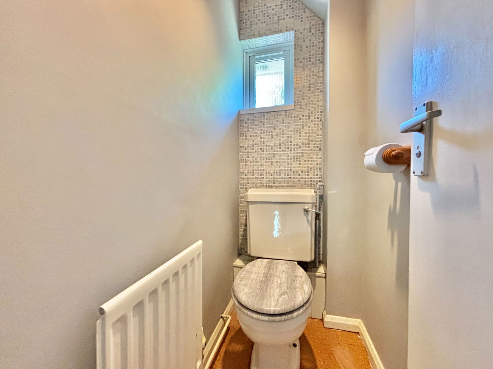 CLOAKROOM A low level flush WC, a uPVC obscure double glazed window and a gas central heated radiator.