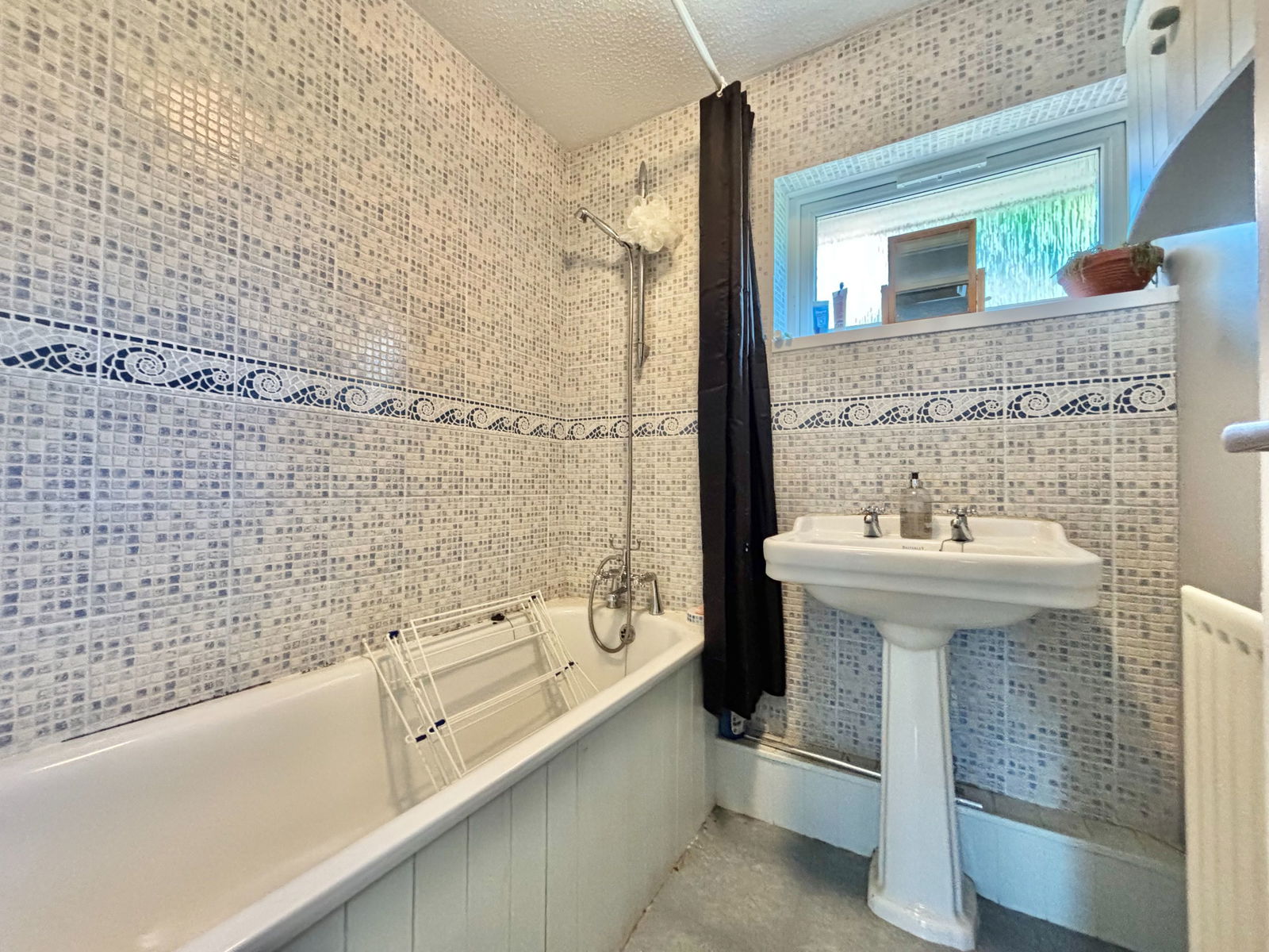 BATHROOM A pedestal wash hand basin and a panelled bath unit with shower attachments above. Tiled walls, uPVC obscure double glazed window and a gas central heated radiator.