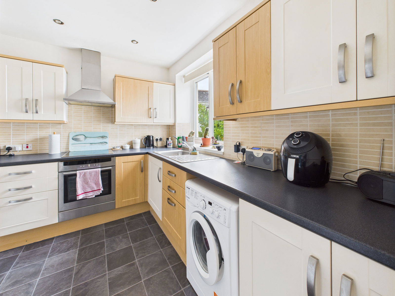 KITCHEN/BREAKFAST ROOM - 3.68m max x 3.35m max – A range of wall and base-mounted units with complementary rolled-edge work surfaces. The work surface includes an inset chrome sink and drainer with a chrome mixer tap. A large uPVC double-glazed window overlooks the rear. The kitchen includes a four-ring electric hob, integral oven, and a filter hood above. A built-in larder cupboard conceals the wall-mounted gas boiler. Wall-mounted radiator and space for a tall fridge/freezer. The center of the room offers space for a table and chairs. Vinyl flooring, ceiling spotlight, and wall-mounted consumer unit.