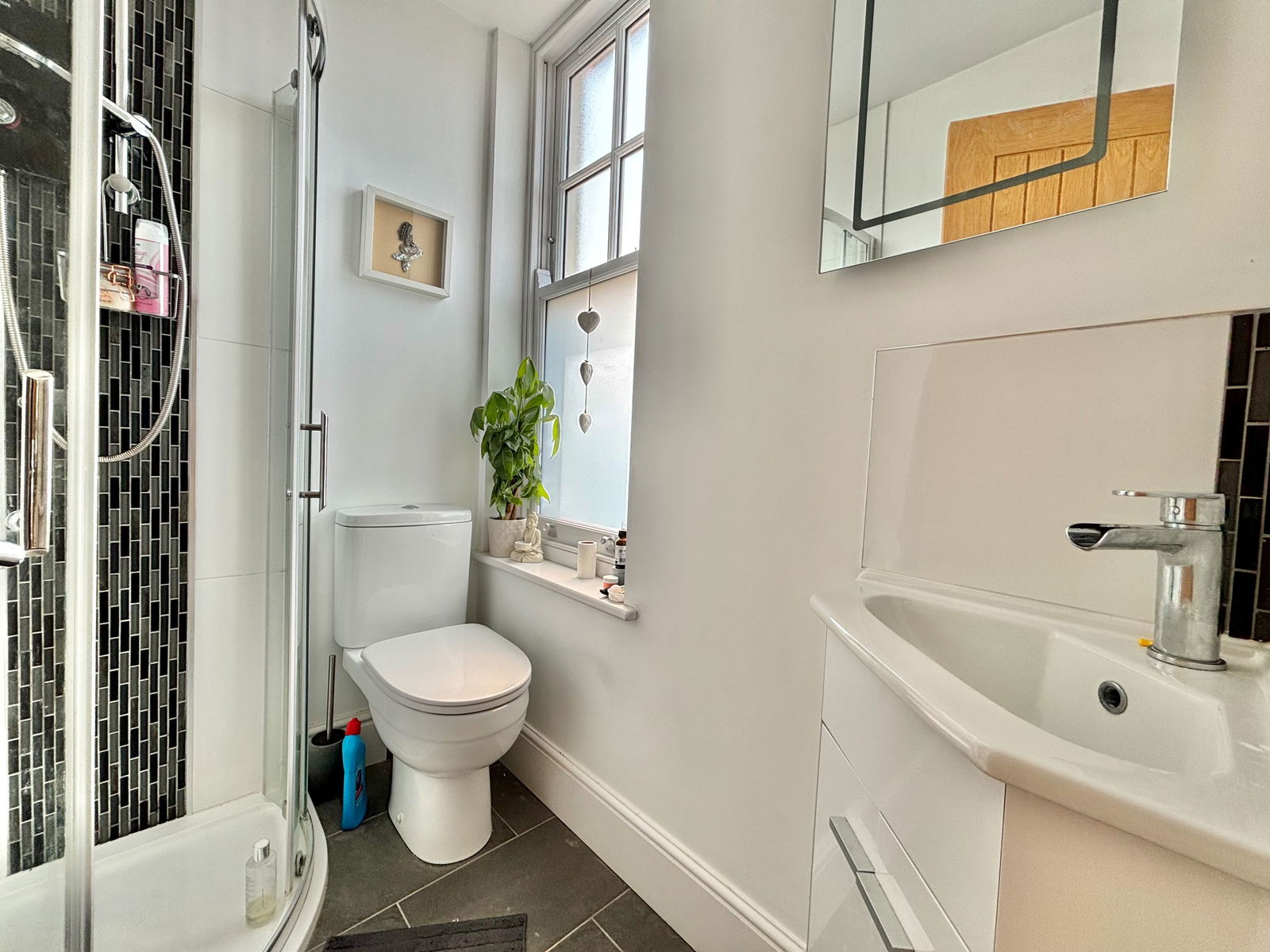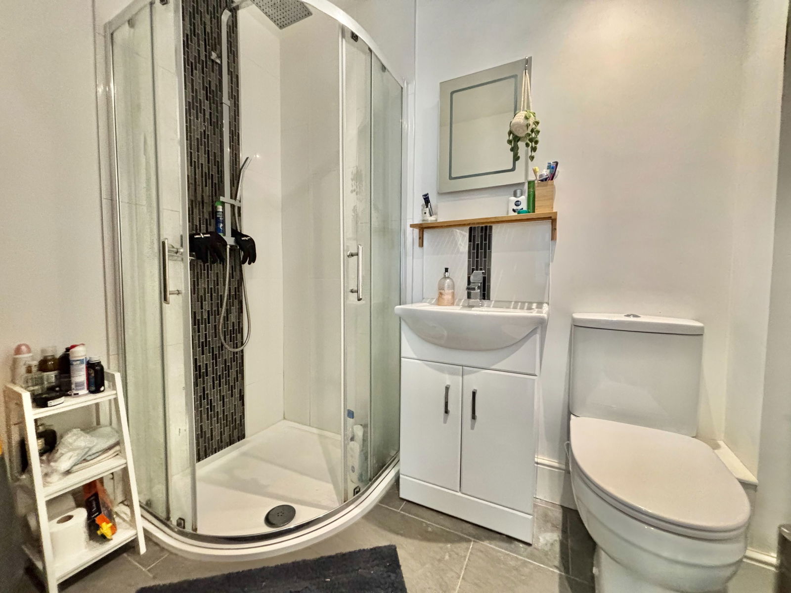 EN-SUITE A modern en-suite comprising of a low level flush WC, a wall mounted wash hand basin with fitted storage below and a walk in corner shower unit. Complimentary tiling, an obscure double glazed window and a heated towel rail.