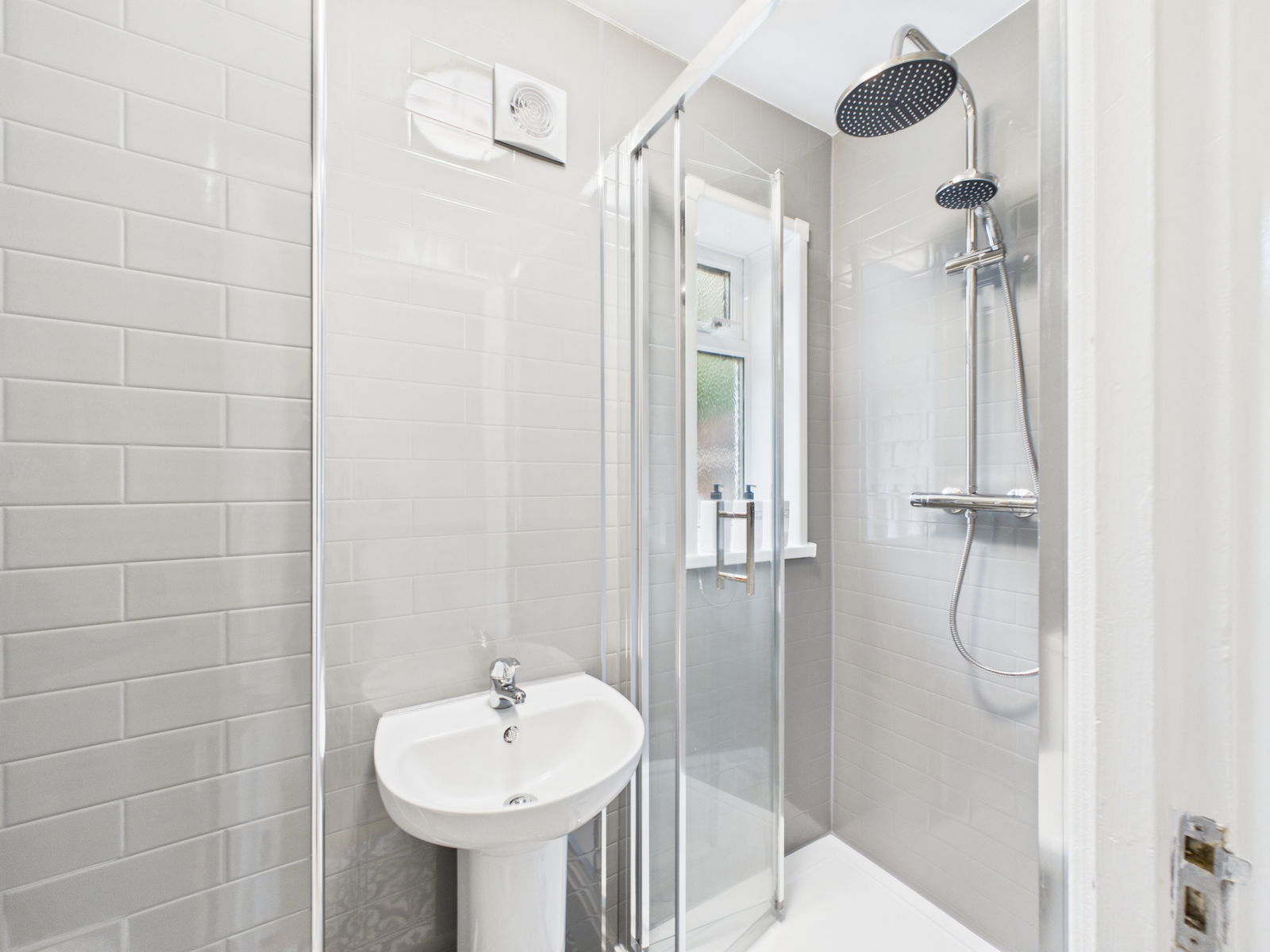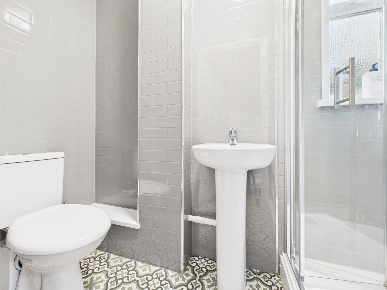 DOWNSTAIRS SHOWER ROOM A newly installed, contemporary shower room featuring a low level WC, pedestal wash hand basin and walk in shower enclosure. Modern panelling, extractor fan and a uPVC obscure double glazed window.