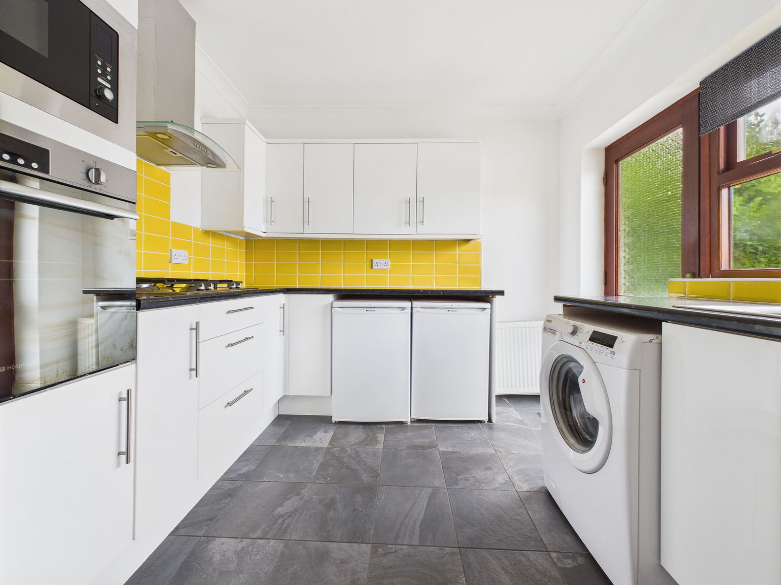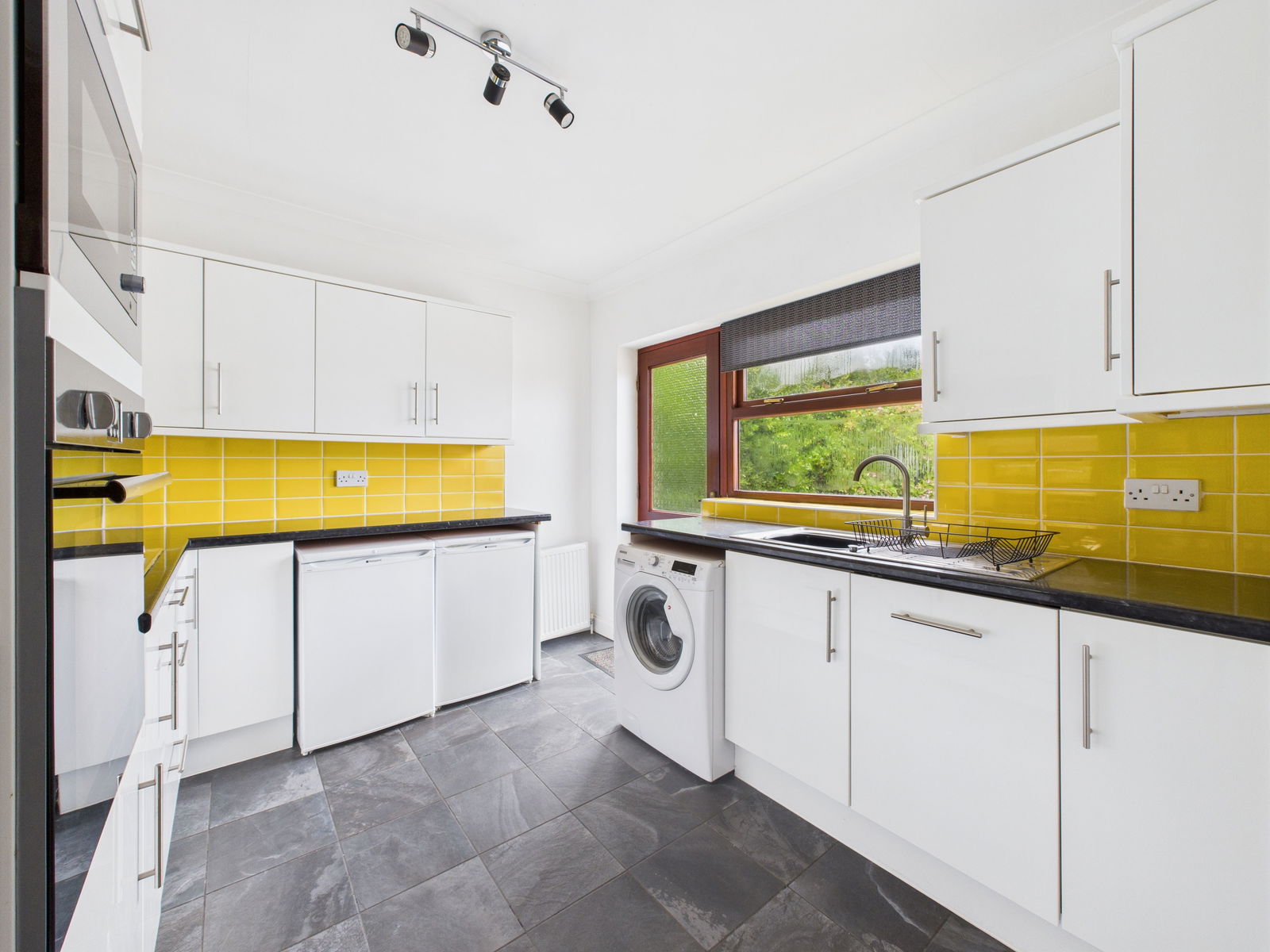 KITCHEN A contemporary fitted kitchen offering a range of overhead, base and drawer units with roll edged work surfaces. The space includes a stainless steel sink and drainer, an integrated eye level electric oven with grill, a four ring gas hob with extractor hood, integral microwave and dishwasher. There is additional space for a fridge and freezer. Tiled splashbacks, double glazed windows and a door lead directly to the gardens.