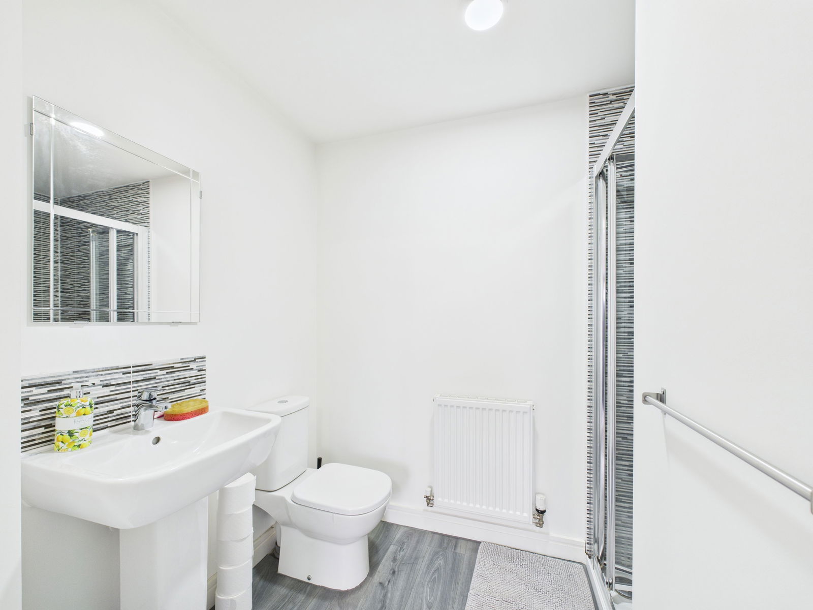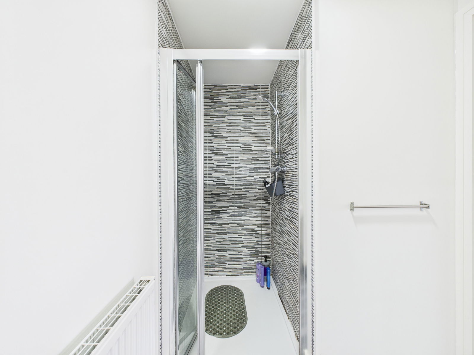 EN-SUITE A stylish en-suite shower room comprising a low level WC, pedestal wash hand basin and a generous walk in double shower enclosure. Finished with part tiling, extractor fan, and a gas central heating radiator.