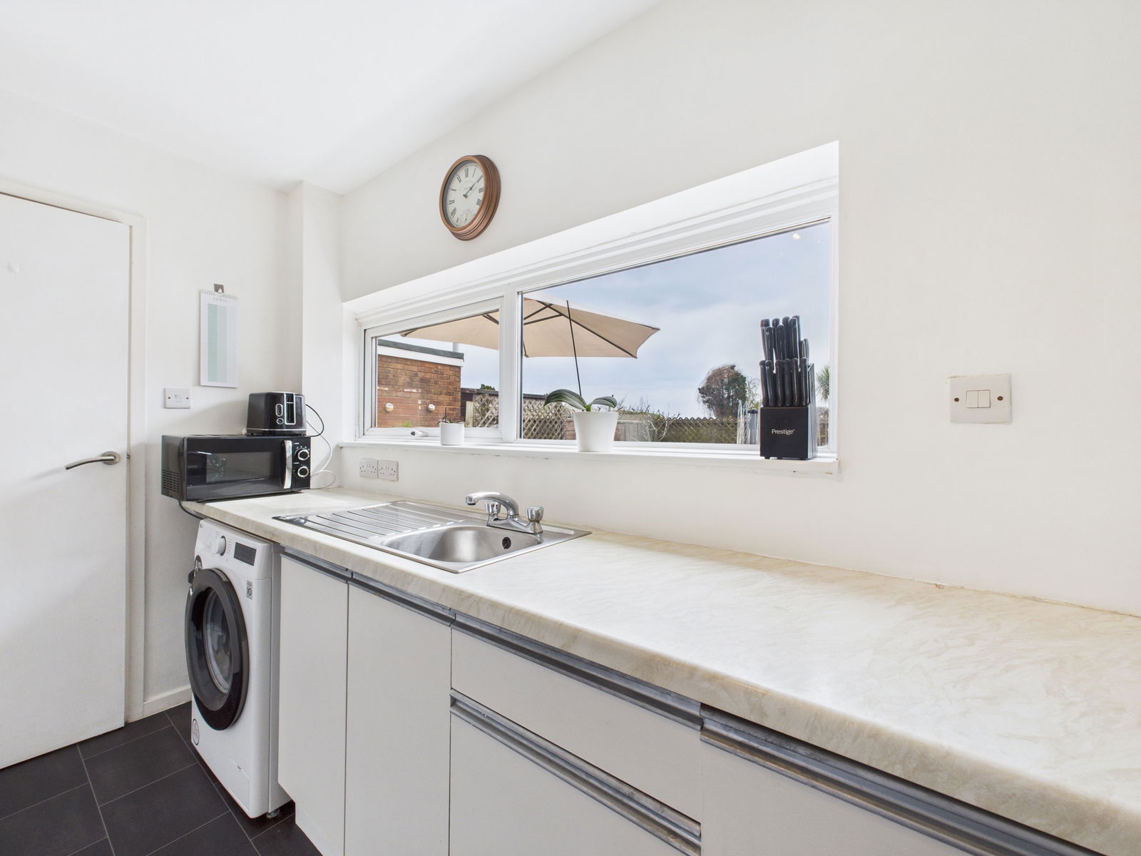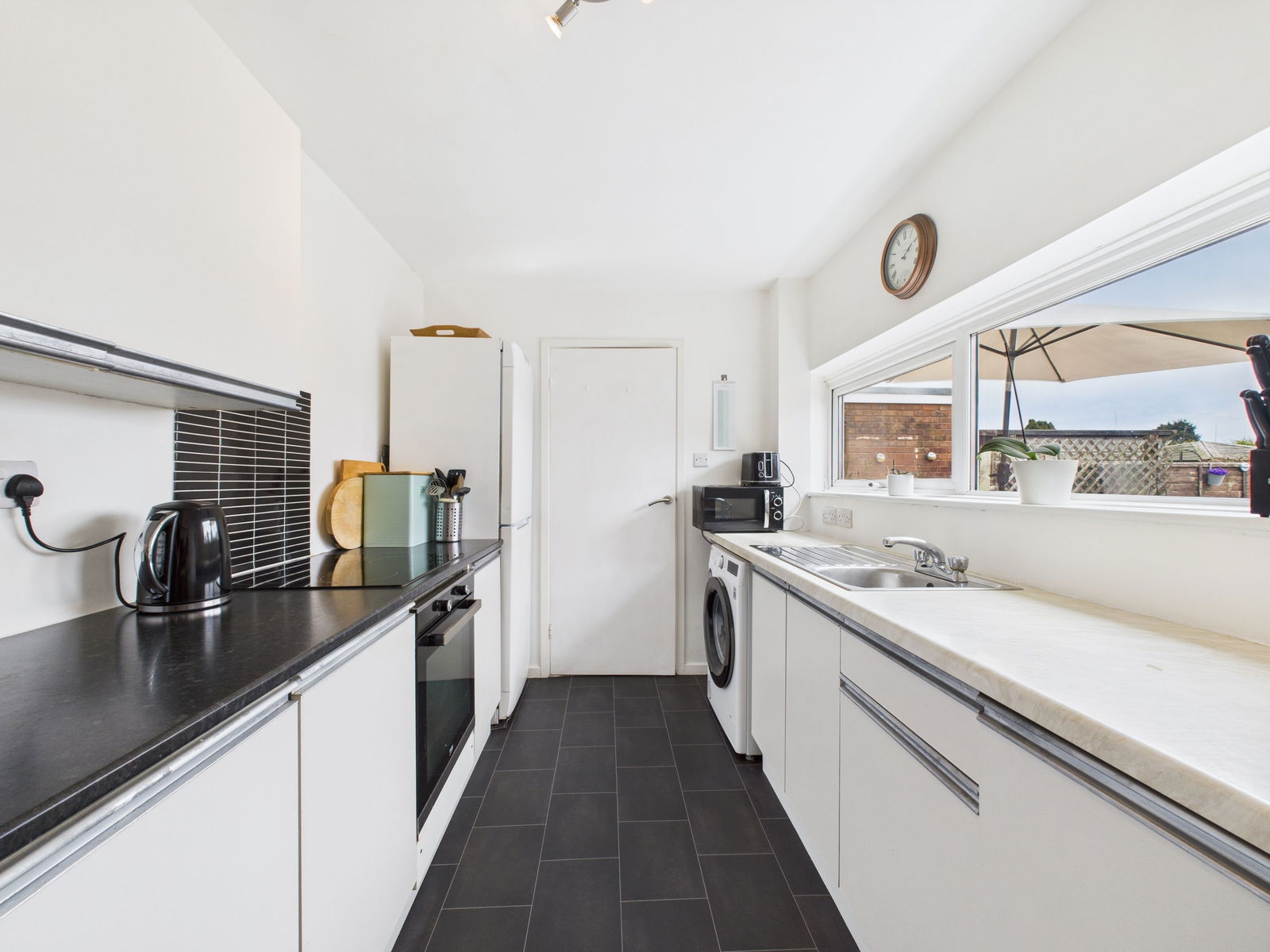 KITCHEN A sizeable kitchen boasting a range of overhead, base and drawer units with roll edged work surfaces above. A 1 bowl stainless steel sink and drainer unit, an electric single oven with grill integrated and a four ring induction hob, space and plumbing for a washing machine and fridge. uPVC double glazed window.