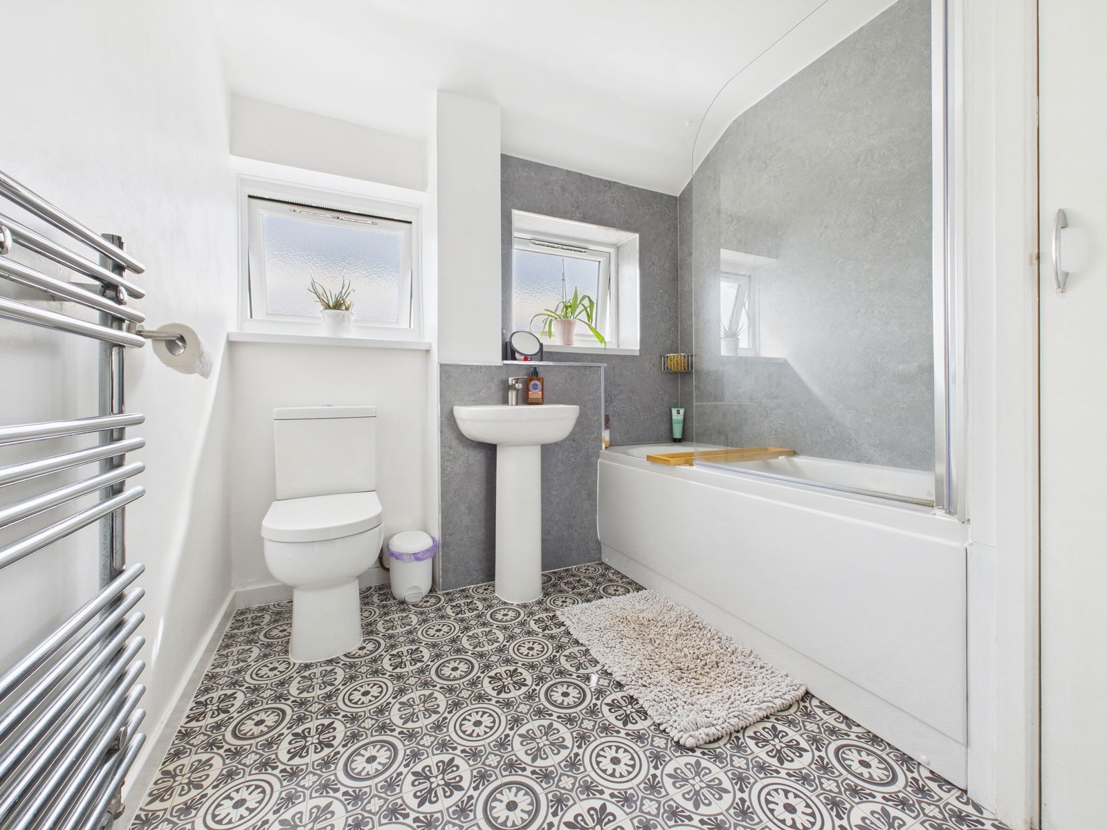BATHROOM A spacious and modern family bathroom comprising of a low-level flush WC, a pedestal wash hand basin and a panelled bath unit with shower attachment above and a protective glass shower screen. Two uPVC obscure double glazed windows and a chrome heated towel rail.
