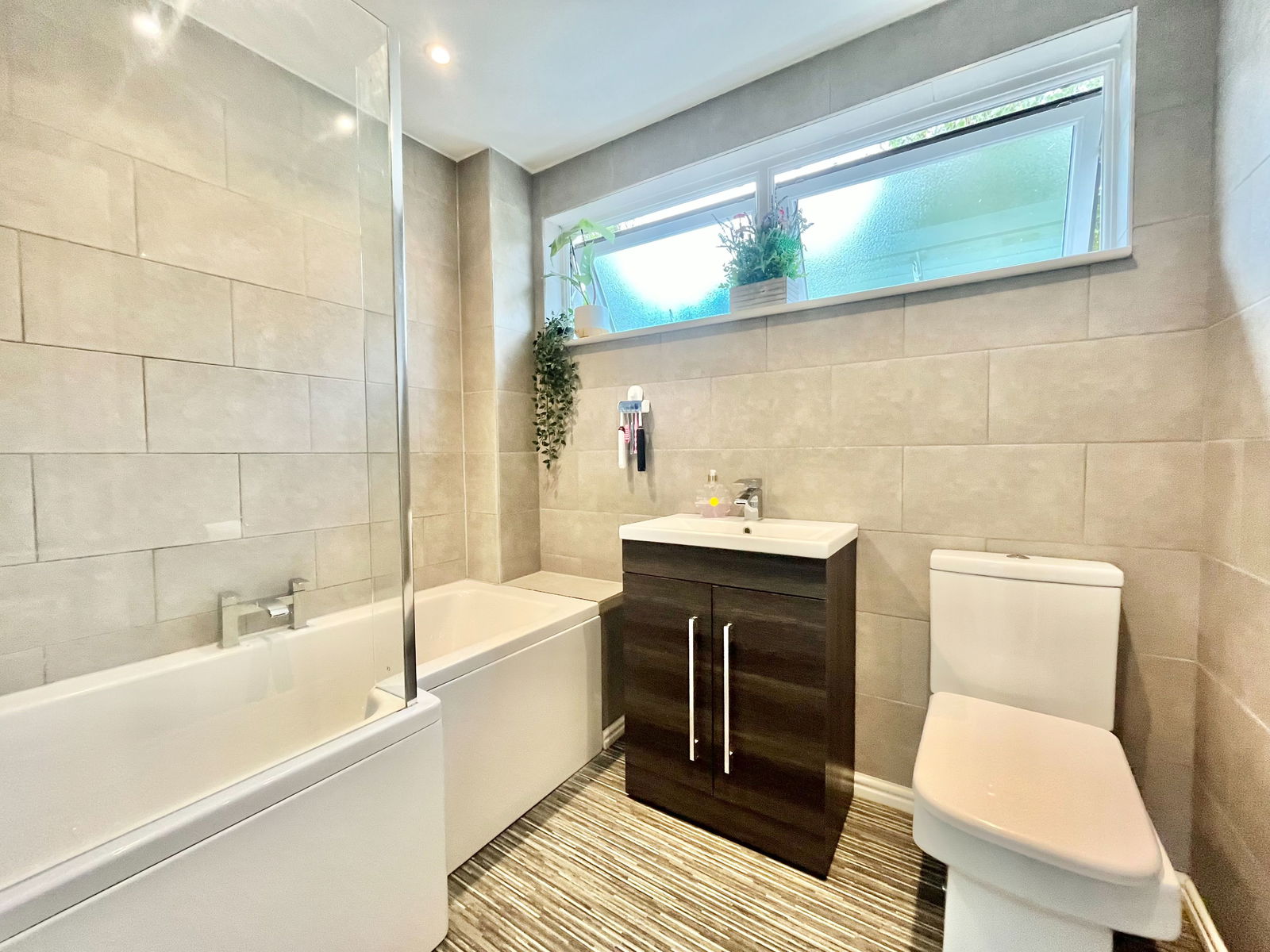 BATHROOM A modern family bathroom comprising of a low level flush WC, a vanity wash hand basin with fitted storage below and a panelled P shaped bath unit with shower attachments above and protective glass shower screen. Tiled walls, a uPVC obscure double glazed window and a chrome heated towel rail.