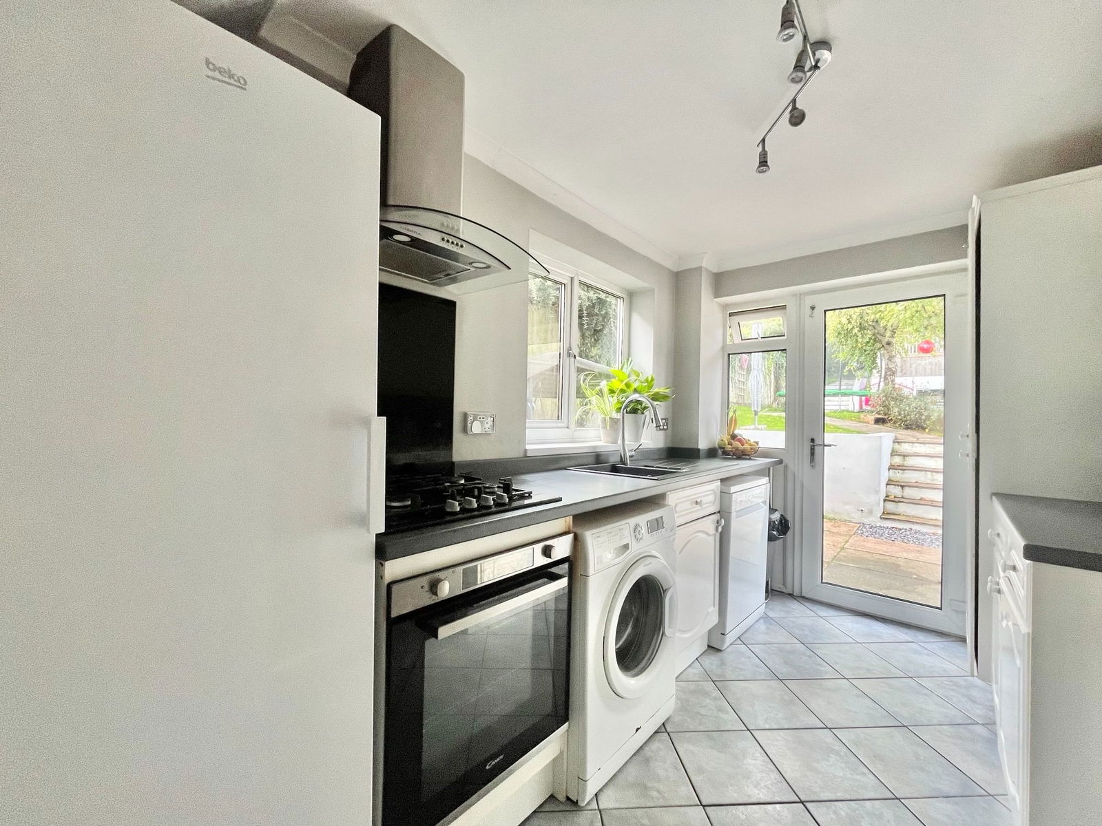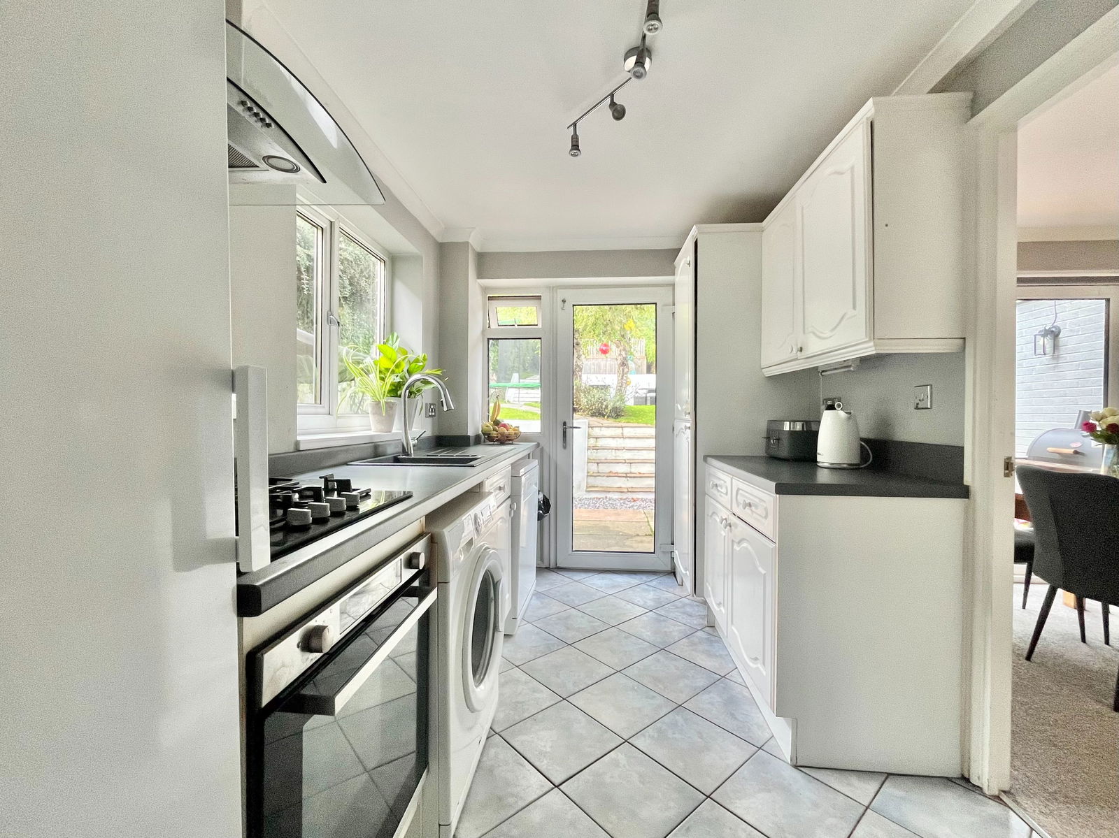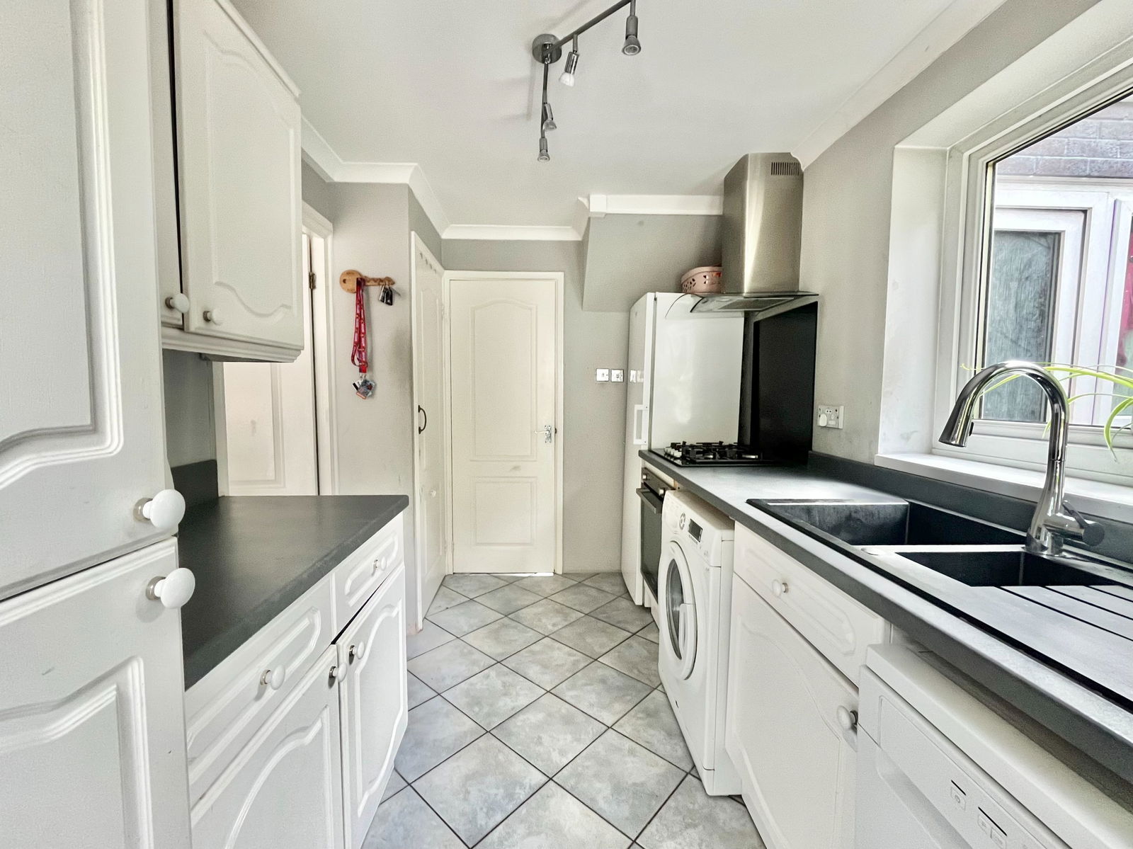 KITCHEN - 3.53m x 2.38m (11'6" x 7'9") A fitted galley style kitchen boasting a range of overhead, base and drawer units with roll edged work surfaces above. A 1 1/2 bowl composite sink and drainer unit, an electric single oven with grill integrated and four ring gas hob with extractor hood above. Space and plumbing for a washing machine and fridge freezer. A deep pantry cupboard, uPVC double glazed window and a uPVC double glazed door leading out to the rear.