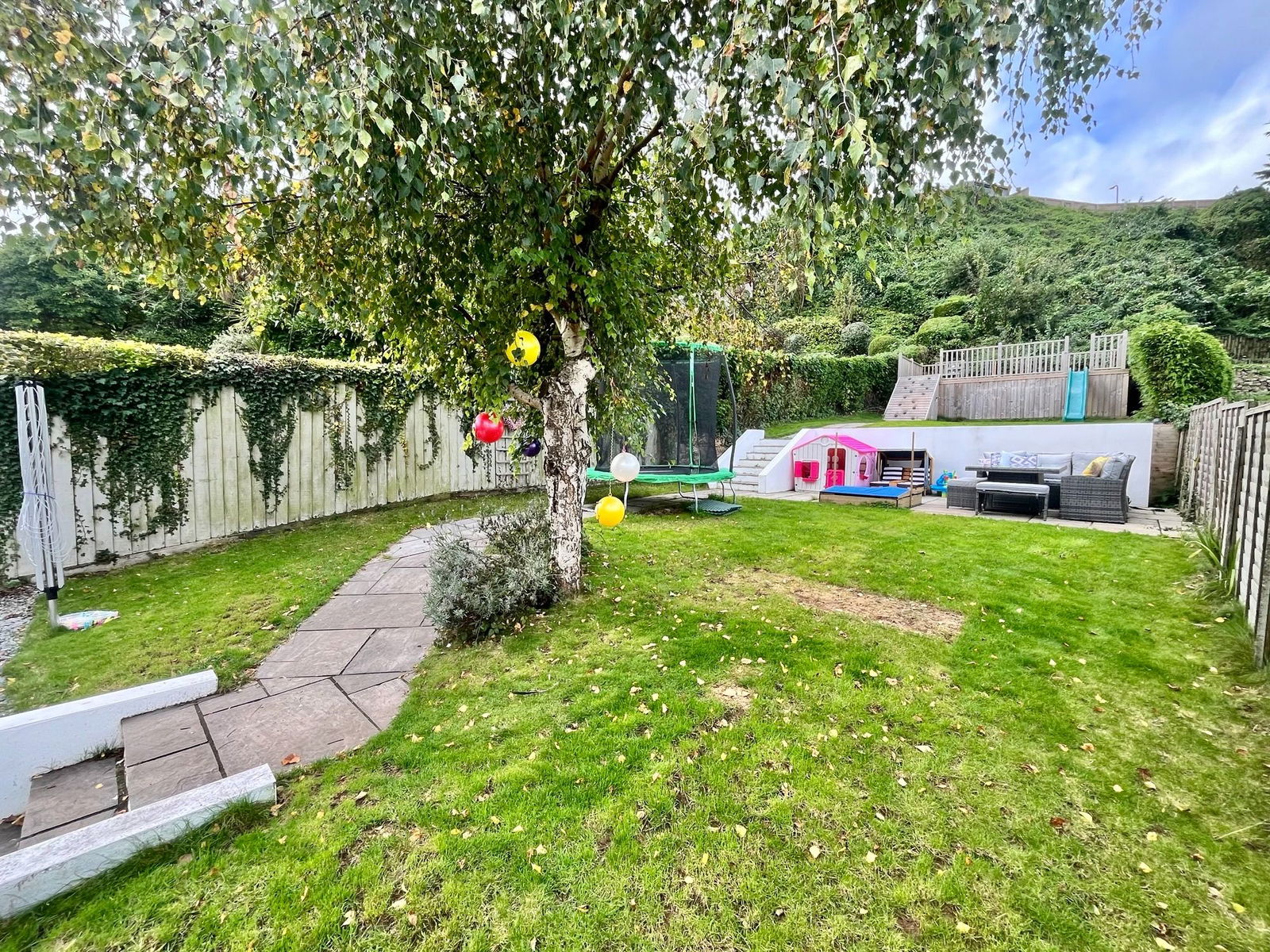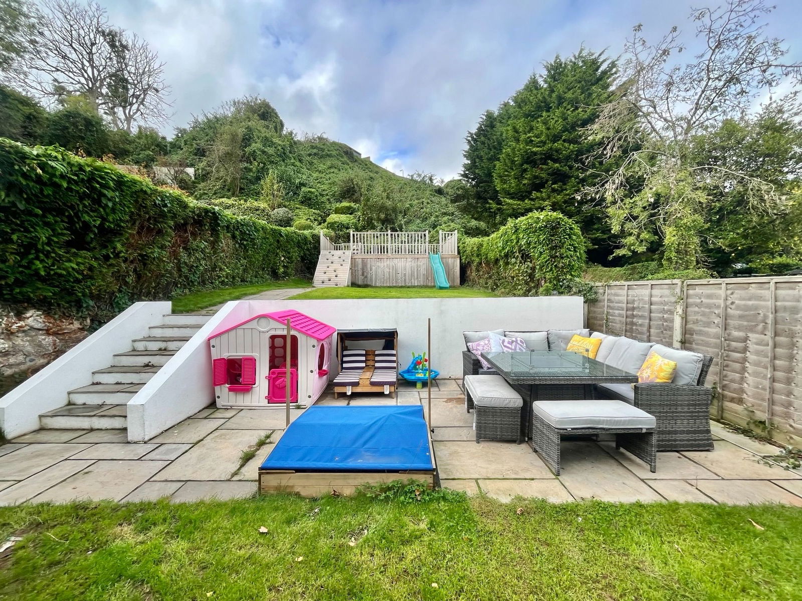 OUTSIDE A large and sunny rear garden that has been designed over 3 levels with a sizeable patio area perfect for outdoor dining and entertaining off of the kitchen and dining area, with a few steps then leading up to a large lawned section with an additional patio area and then lastly the third tier has been thoughtfully designed for children with a large decking area with a rock climbing wall and slide.