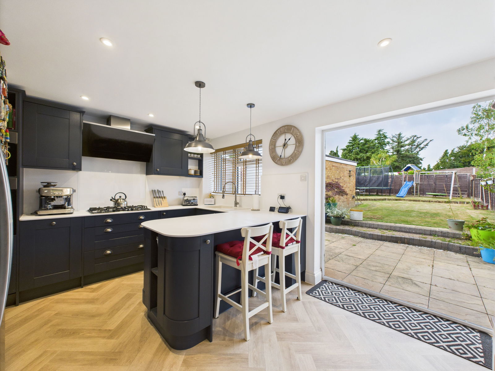 The dining area comfortably accommodates an 8 seater dining table, complete with bespoke built in bench seating and under seat storage. uPVC double glazed bifold doors open onto the garden and a sleek vertical gas central heated radiator.