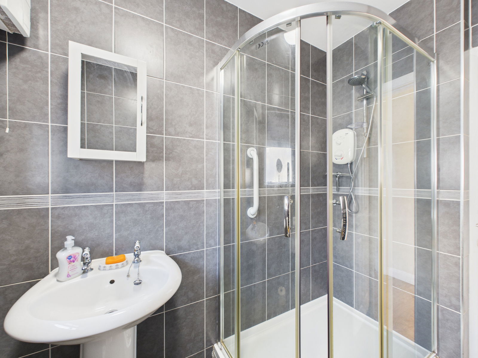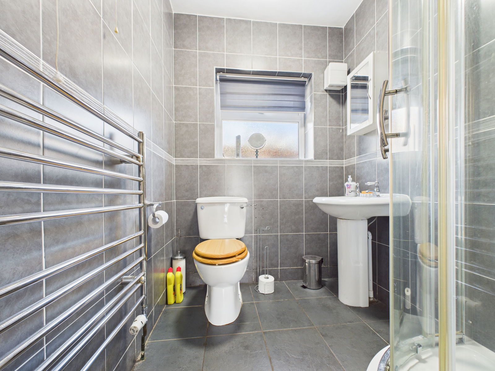 SHOWER ROOM/WC Modern suite comprising WC, pedestal basin and double corner shower with electric unit. Fully tiled, chrome towel radiator, electric heater, obscure window and loft access.