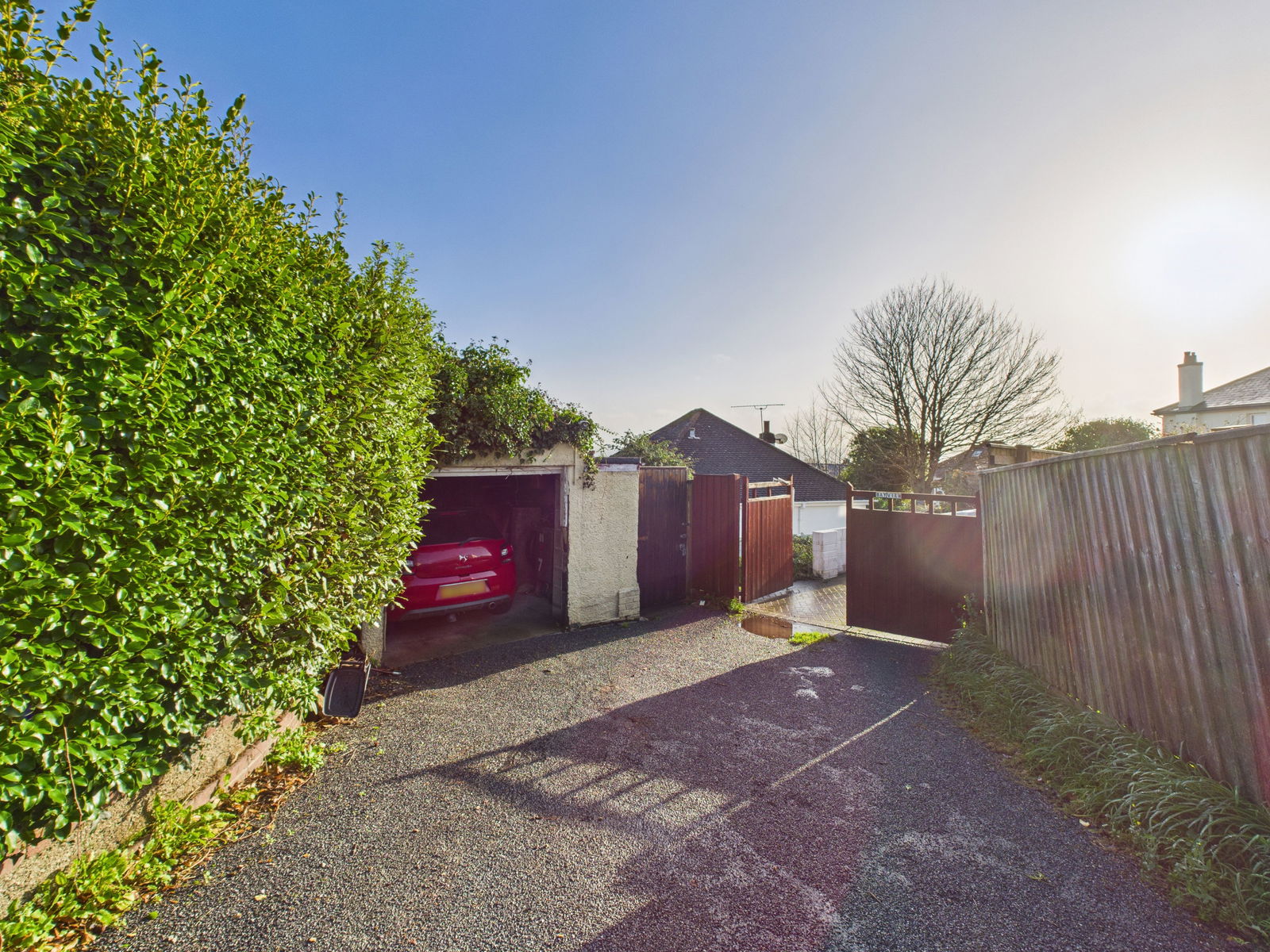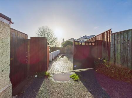 REAR Gated block-paved driveway providing parking for up to two vehicles, accessed via a private lane off Preston Down Road. Rear garden mainly laid to lawn with pathways, space for seating, washing line and outside tap.