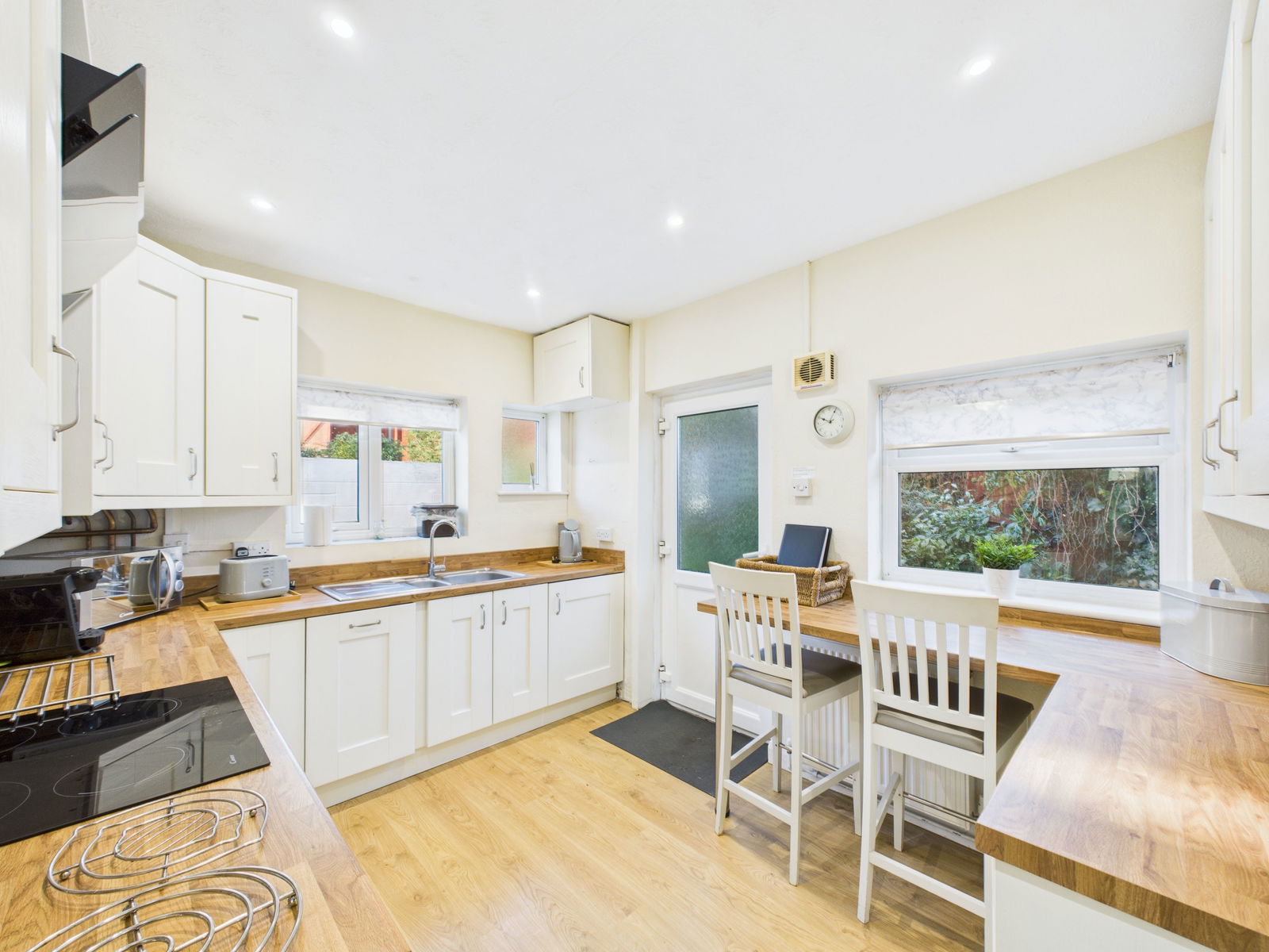 KITCHEN/BREAKFAST ROOM Fitted wall and base units, breakfast bar, integrated fridge, slimline dishwasher, washing machine, electric oven and ceramic hob with extractor. Windows to the rear and side, obscure glazed door to the side, sink unit, gas boiler and cupboard housing the consumer unit.